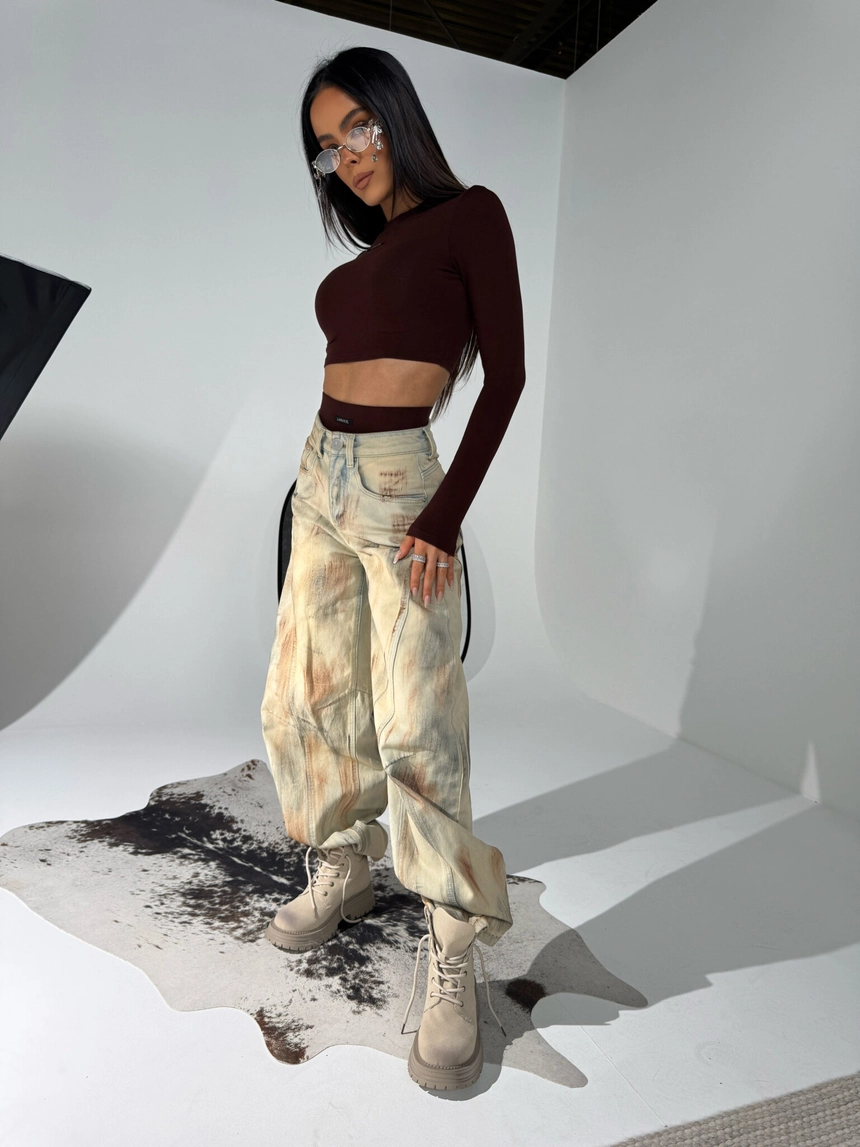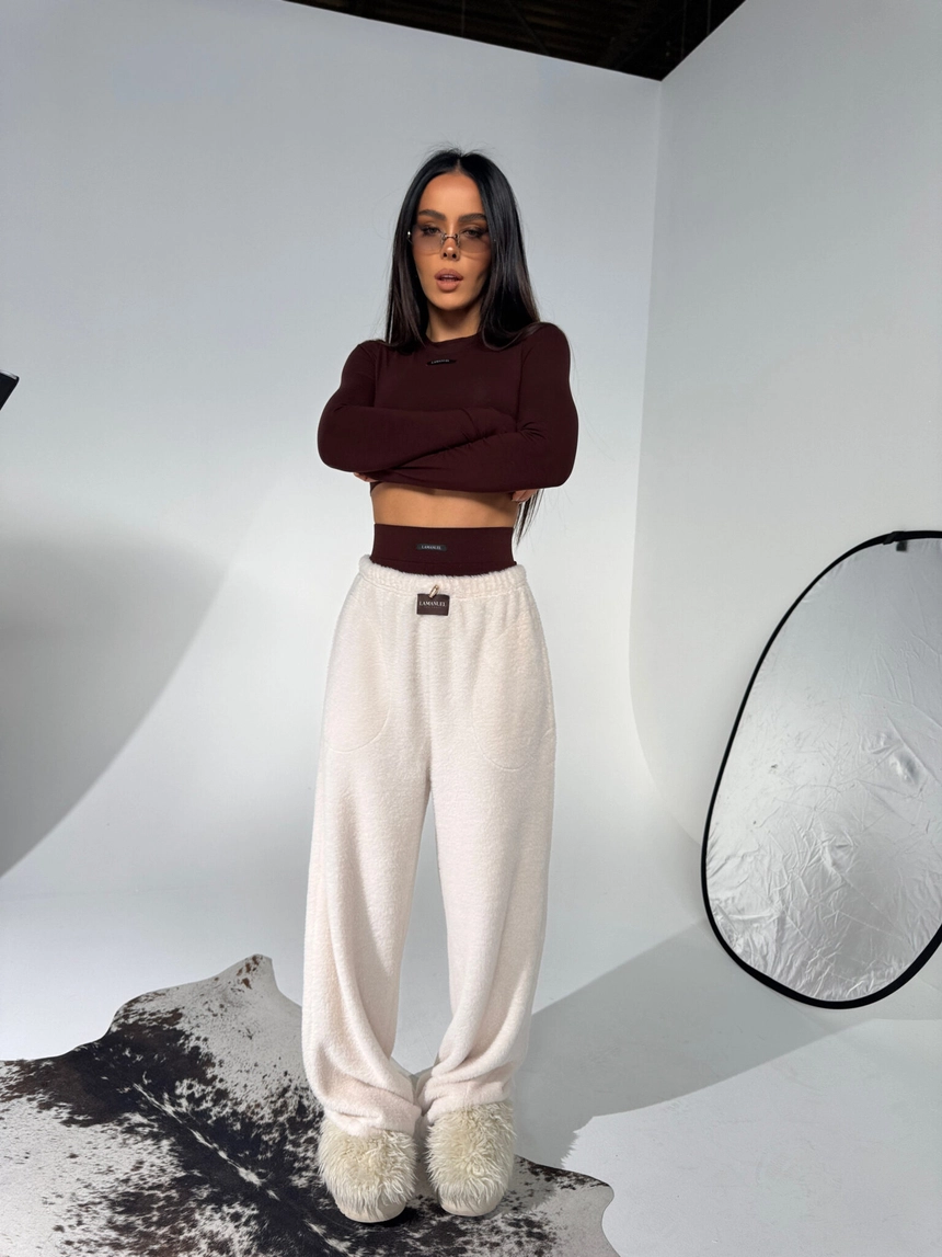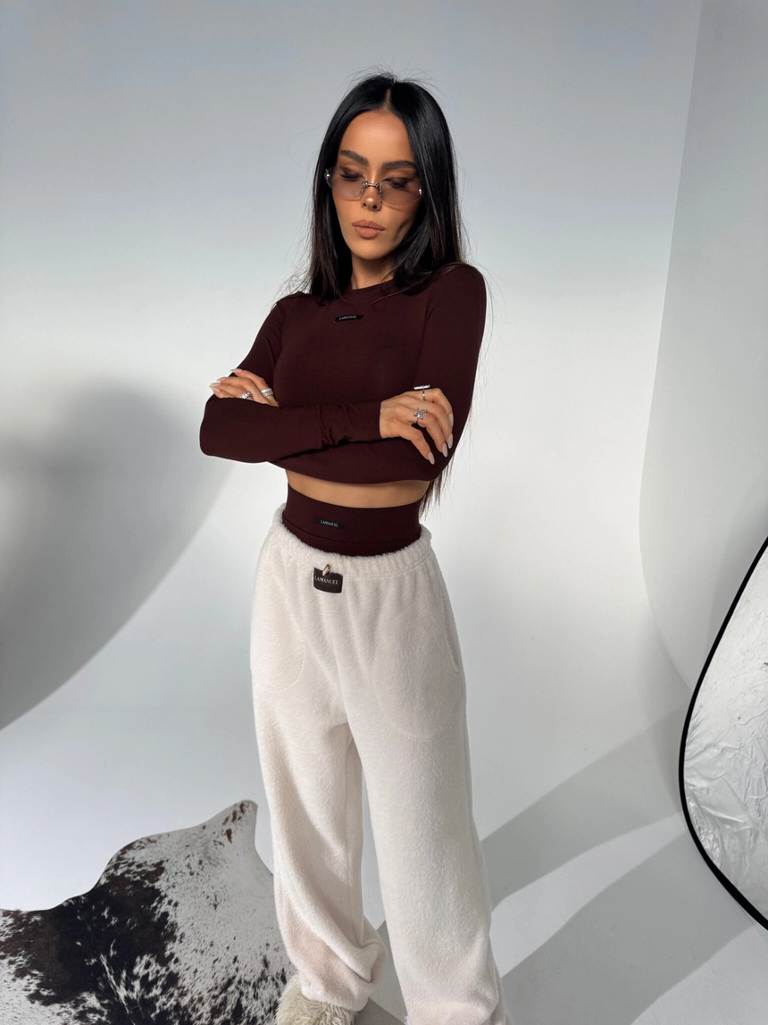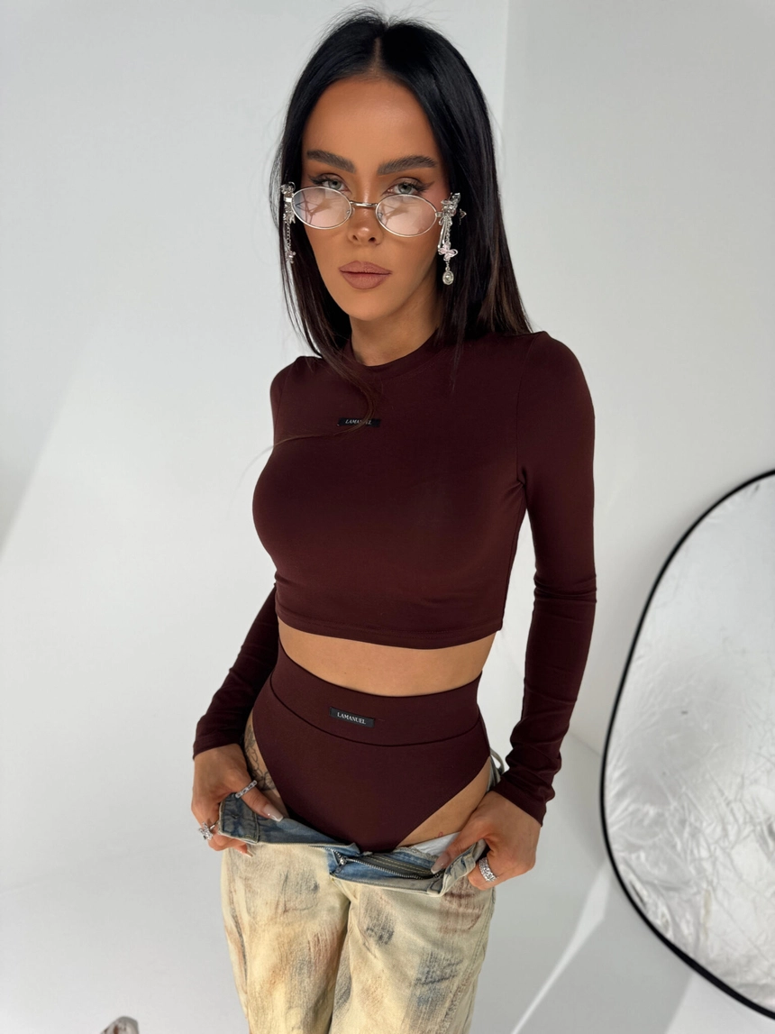 Komplet bieliźniany z wiskozy, składający się z dopasowanego topu z długim rękawem oraz majtek typu stringi z wysokim stanem. Materiał jest miękki, elastyczny i komfortowy w noszeniu, a jednocześnie pięknie układa się na ciele. Top ma minimalistyczną formę z niewielkim logotypem przy dekolcie i idealnie dopasowaną długość – sprawdzi się zarówno jako bielizna, jak i element stylizacji. Wysokie majtki modelują sylwetkę i nie odznaczają się pod ubraniem. Całość tworzy kobiecą, nowoczesną bazę, którą można wykorzystać na wiele sposobów – od noszenia solo, po zestawienie z jeansami czy oversize’ową marynarką.Skład: 95% wiskoza 5% elastan