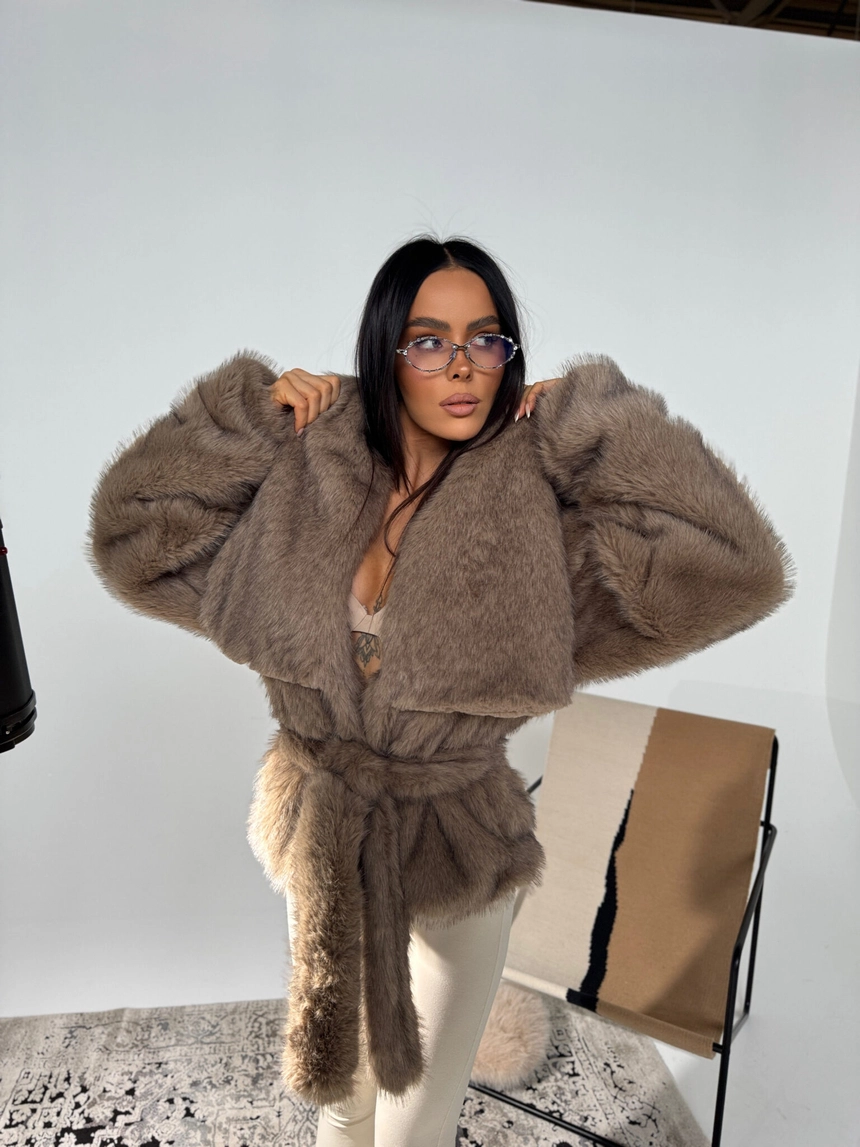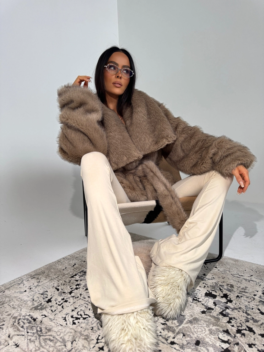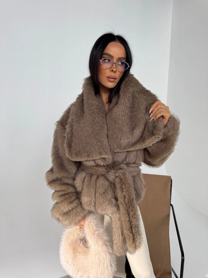 Wyjątkowe futro o luksusowym wyglądzie i kobiecej formie. Mięsista, gęsta tkanina imitująca naturalne futro nadaje całości elegancji, a przy tym skutecznie chroni przed chłodem. Model z obszernym kołnierzem, lekko opuszczoną linią ramion i wiązaniem w pasie, które pięknie podkreśla sylwetkę. Długość do bioder sprawia, że pasuje zarówno do spodni, jak i sukienek. Wygodne, wsuwane rękawy i przemyślany krój zapewniają komfort noszenia i modowy efekt bez wysiłku. Must-have sezonu dla kobiet, które cenią styl, wygodę i jakość wykonania.Skład: 100% poliester