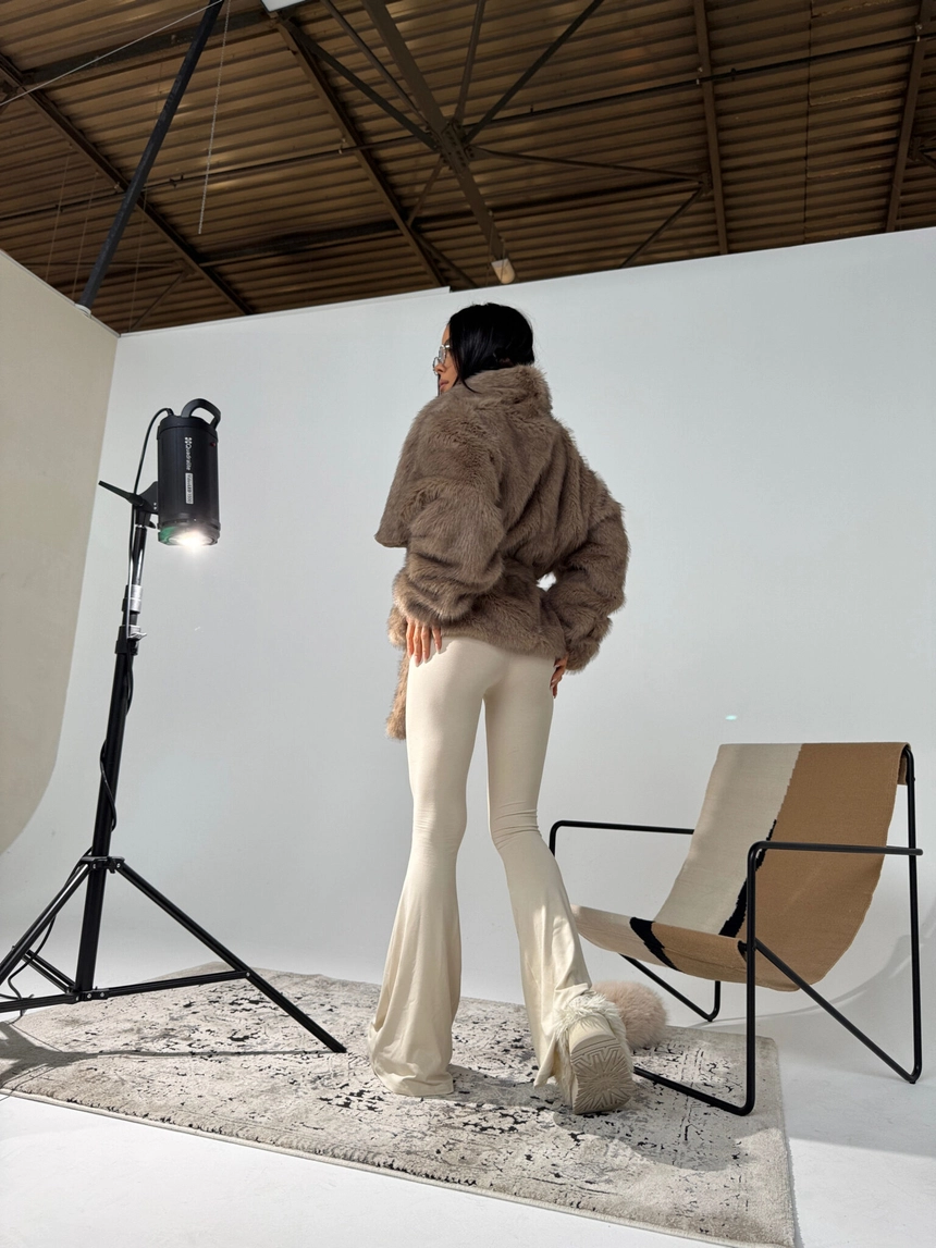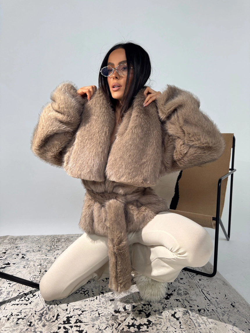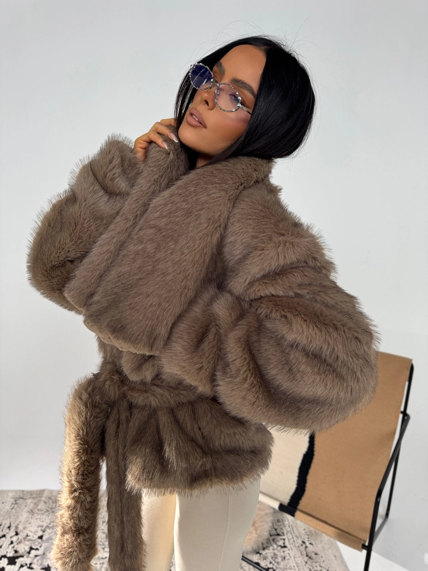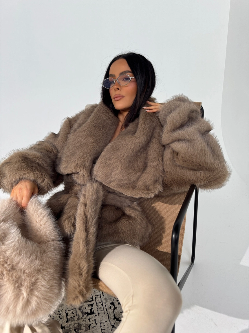 Wyjątkowe futro o luksusowym wyglądzie i kobiecej formie. Mięsista, gęsta tkanina imitująca naturalne futro nadaje całości elegancji, a przy tym skutecznie chroni przed chłodem. Model z obszernym kołnierzem, lekko opuszczoną linią ramion i wiązaniem w pasie, które pięknie podkreśla sylwetkę. Długość do bioder sprawia, że pasuje zarówno do spodni, jak i sukienek. Wygodne, wsuwane rękawy i przemyślany krój zapewniają komfort noszenia i modowy efekt bez wysiłku. Must-have sezonu dla kobiet, które cenią styl, wygodę i jakość wykonania.Skład: 100% poliester