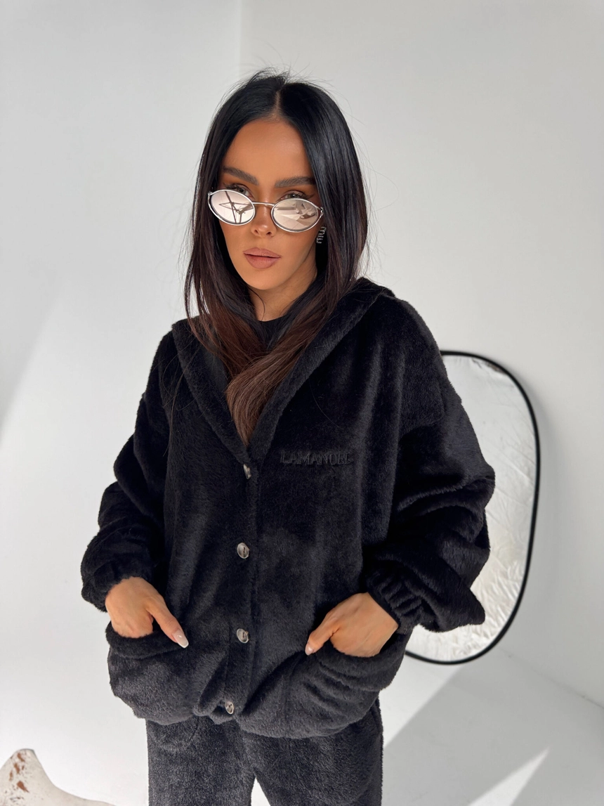 Bluza o oversize’owym kroju, wykonana z ultra miękkiego, puszystego materiału przypominającego misia. Otula jak koc i zapewnia maksymalne ciepło nawet w największy chłód. Luźny fason z obszernym kapturem i dużymi kieszeniami to połączenie stylu i wygody. Zapinana na guziki, wykończona haftowanym logo. Sprawdzi się idealnie podczas zimowych spacerów, wyjazdów w góry i leniwych dni w domu. Możesz ją zestawić z pasującymi spodniami – to komplet stworzony na śnieżne przygody i mroźne poranki.Skład: 71% nylon 29% poliester