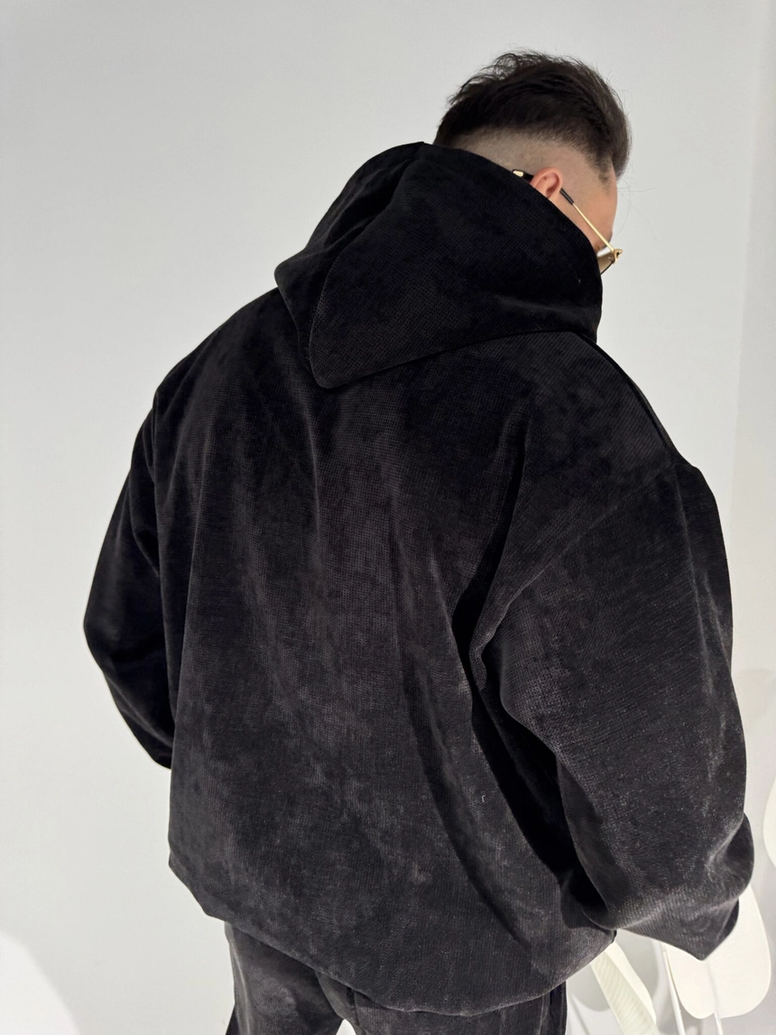 Welurowa bluza z kapturem, która pasuje do stylu après-ski, ale działa też w mieście. Miękka, ciepła, wygodna – zakładasz ją i czujesz, że jesteś dokładnie tam, gdzie powinieneś. Luźny krój, ściągacze, subtelny haft. Idealna po całym dniu na mrozie albo na spokojny wieczór z playlistą zimowych klimatów. Styl domowo-wyjazdowy z klasą.Skład: 95% poliester 5% elastan