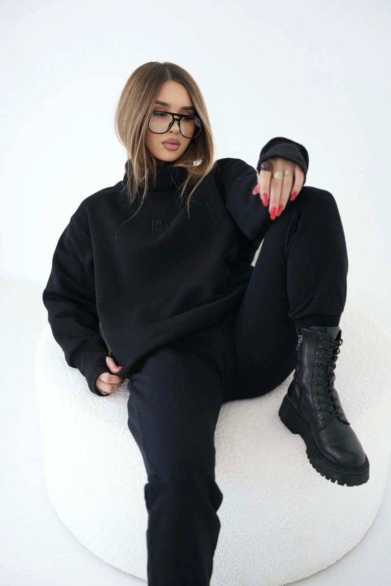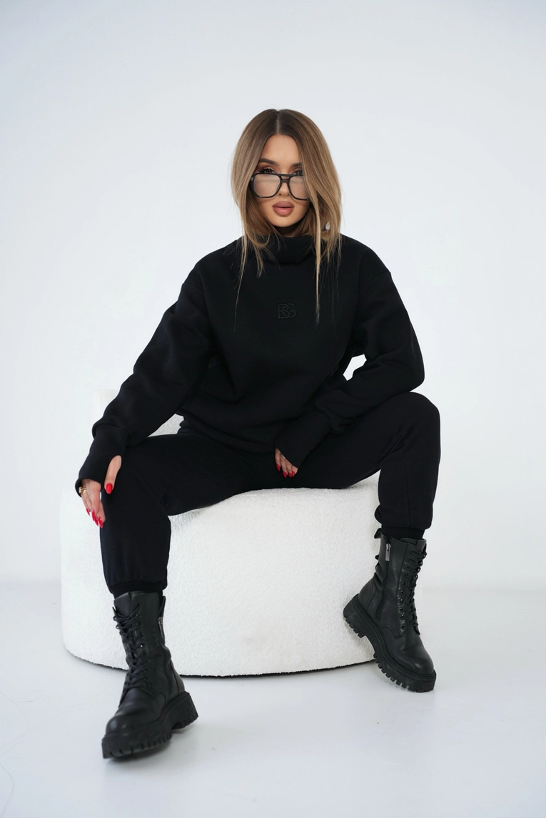 Opis produktu: Oversizowa bluza damska. Gruba, ocieplana od środka dzianina dresowa – mięciutka, ciepła, z delikatnym meszkiem wewnątrz. Na przodzie klasyczne haftowane logo marki BG Brandenburg Couture w tonacji materiału. Dodatkowo dyskretne kieszenie w szwach bocznych, szerokie ściągacze przy rękawach z otworem na palec. Wokół szyi wysoki golf ze ściągacza z możliwością wywinięcia.