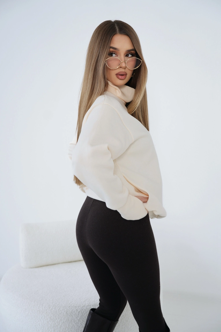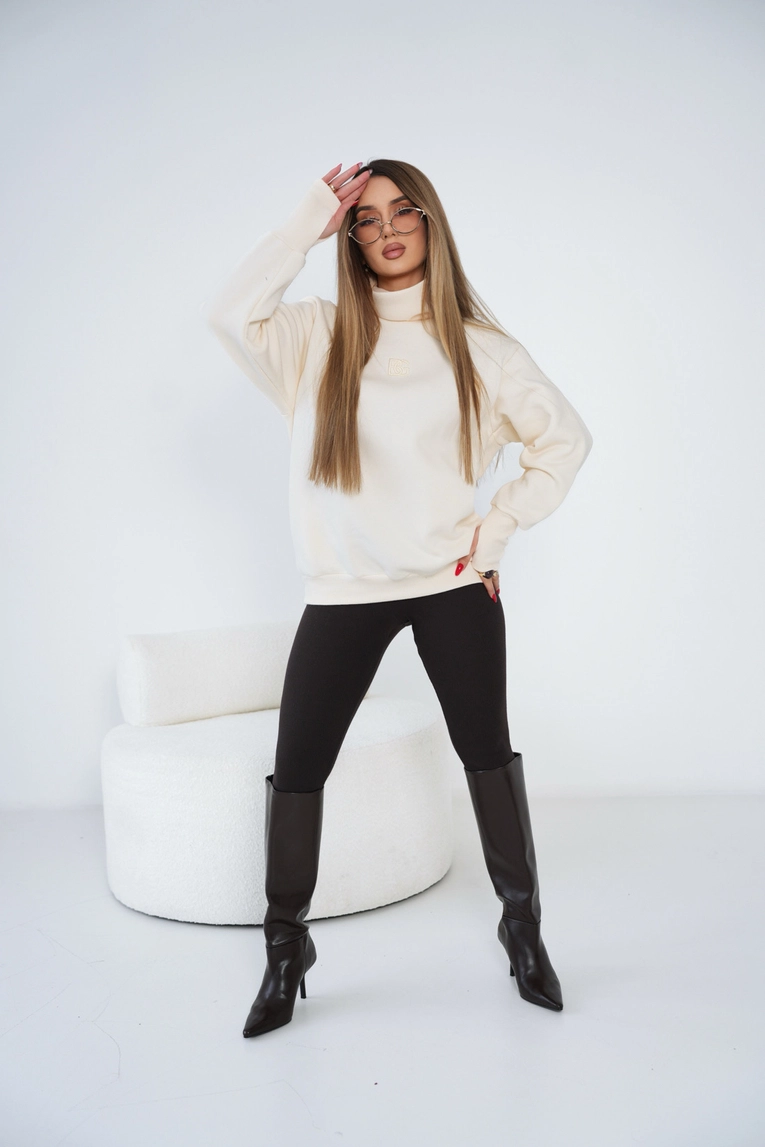 Opis produktu: Oversizowa bluza damska. Gruba, ocieplana od środka dzianina dresowa – mięciutka, ciepła, z delikatnym meszkiem wewnątrz. Na przodzie klasyczne haftowane logo marki BG Brandenburg Couture w tonacji materiału. Dodatkowo dyskretne kieszenie w szwach bocznych, szerokie ściągacze przy rękawach z otworem na palec. Wokół szyi wysoki golf ze ściągacza z możliwością wywinięcia.