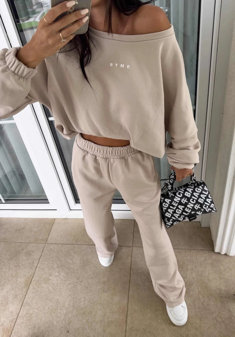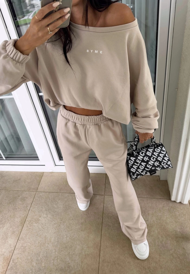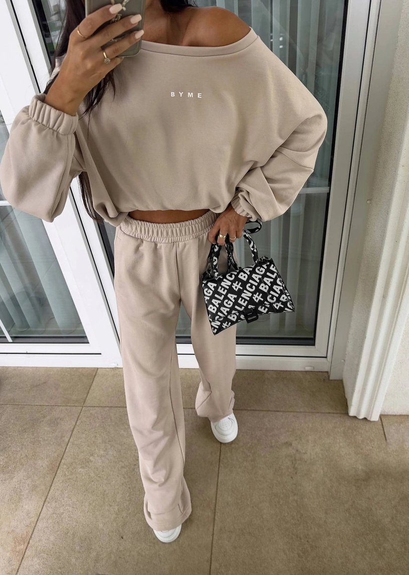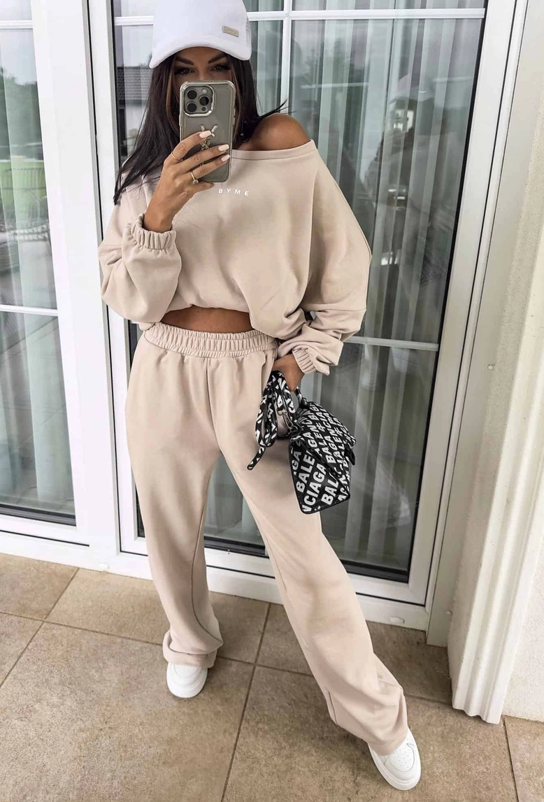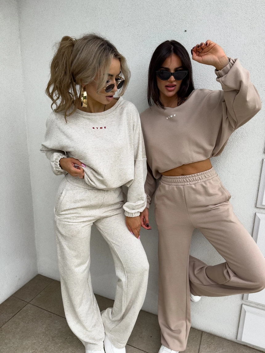 Komplet Sydney składający się z bluzy i spodni. Bluza o prostym, luźnym kroju, z długim rękawem zakończonym gumą. Szerokie spodnie z gumką w pasie