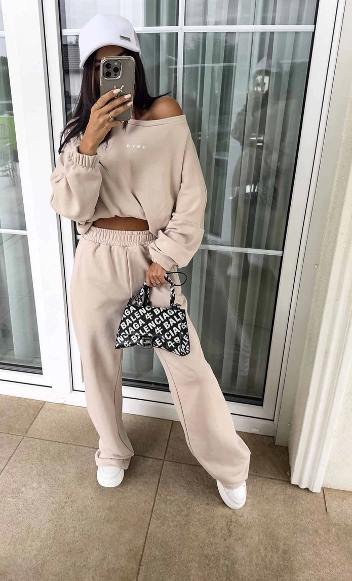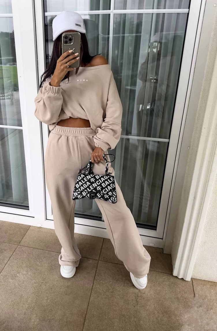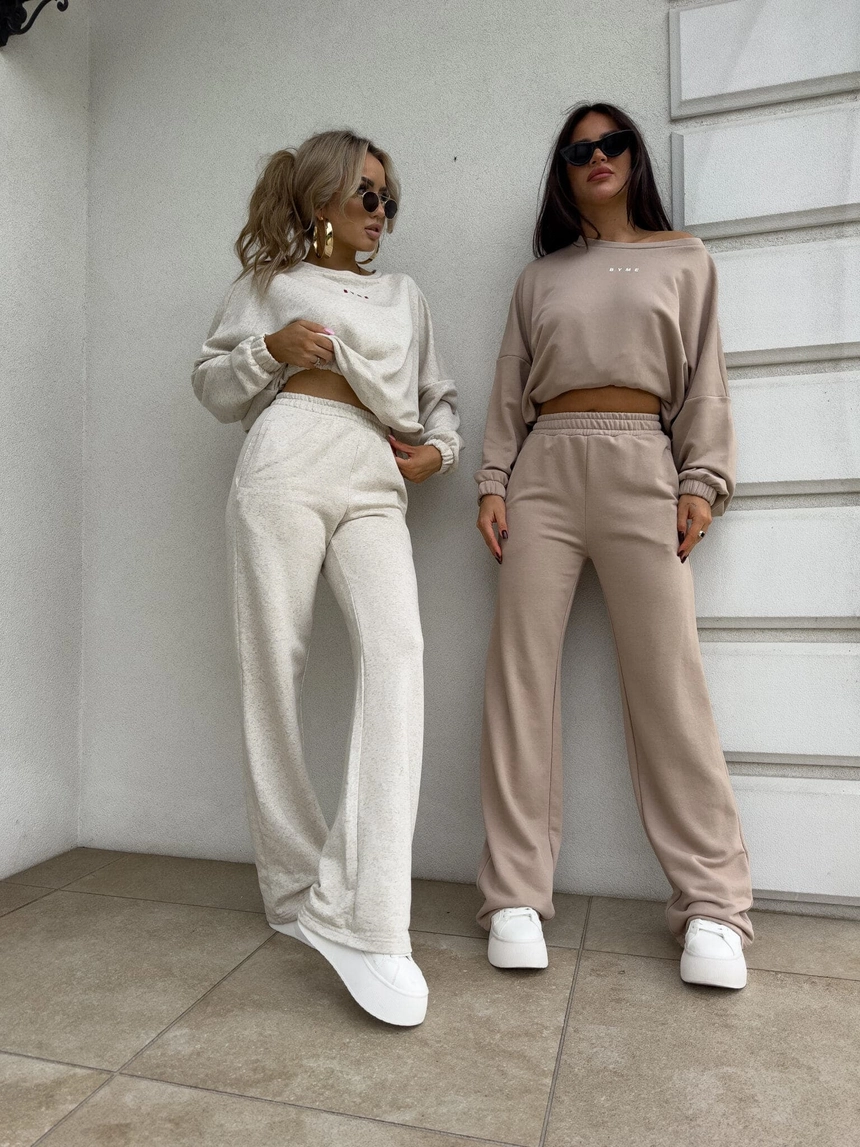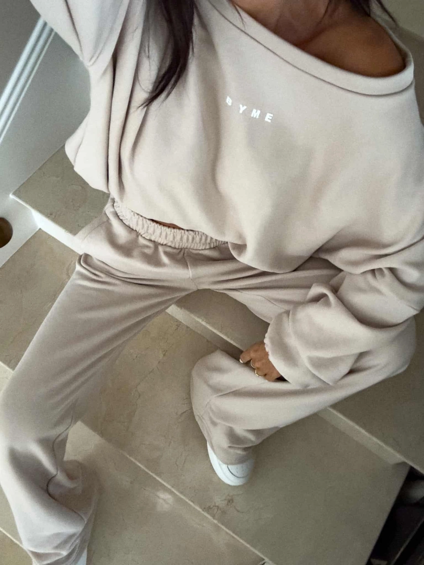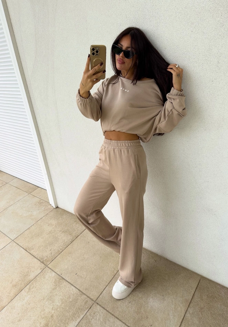 Komplet Sydney składający się z bluzy i spodni. Bluza o prostym, luźnym kroju, z długim rękawem zakończonym gumą. Szerokie spodnie z gumką w pasie