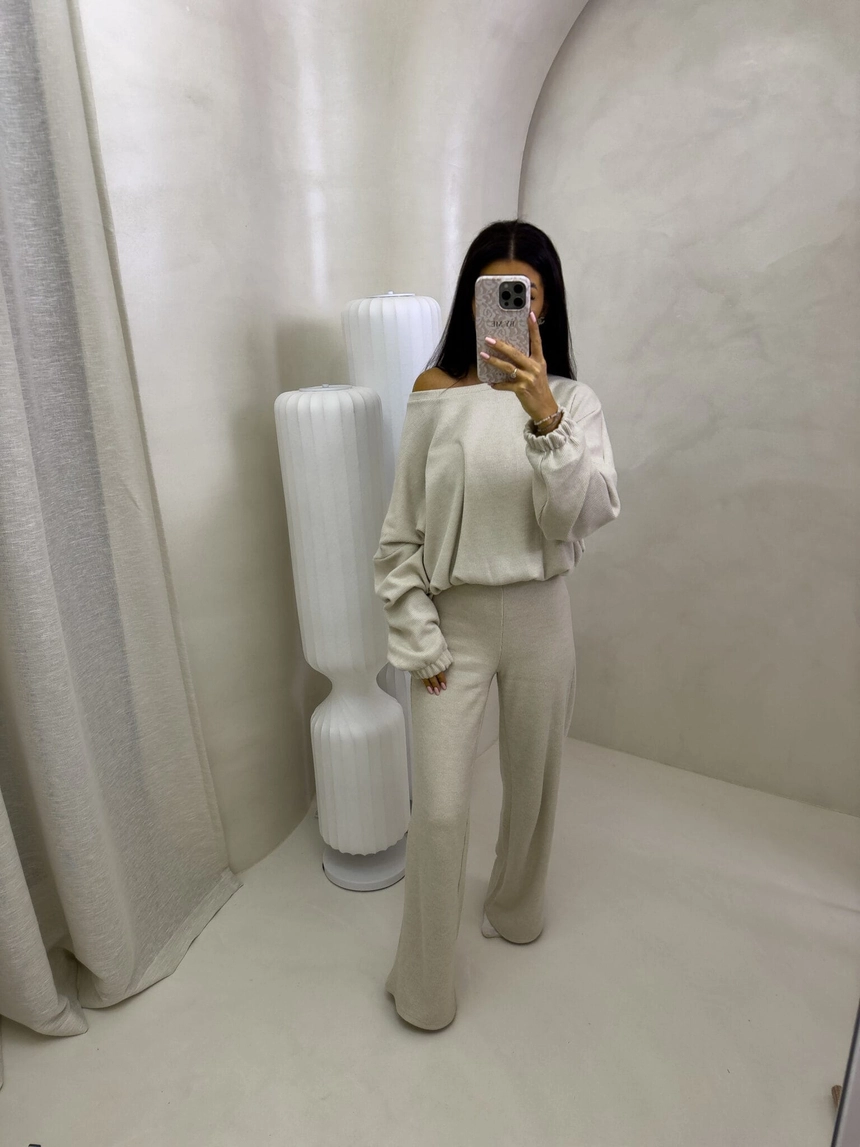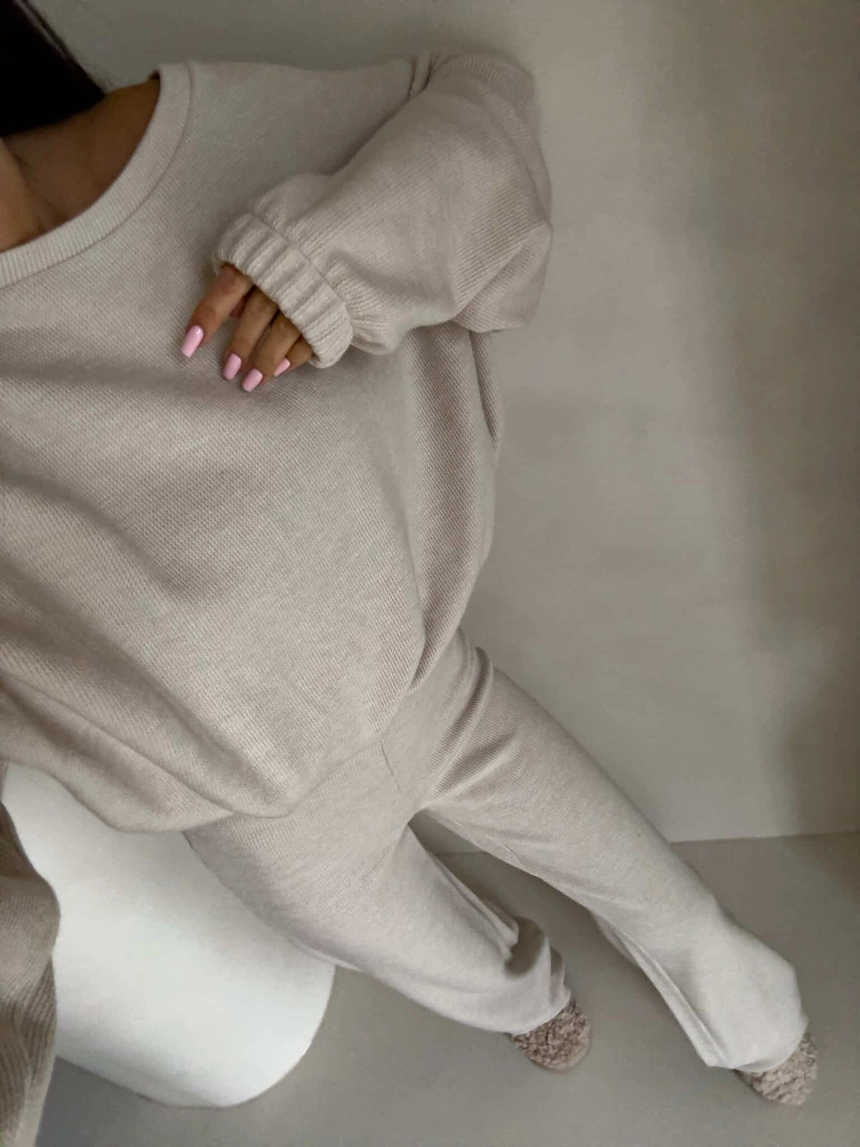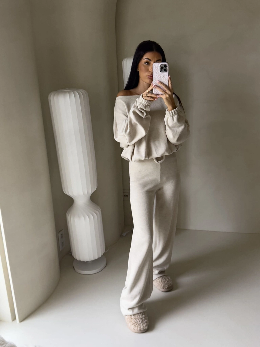 Komplet ANGEL wykonany z najwyższej jakości materiału, bardzo milutkiego. Bluza o prostym, luźnym kroju, z długim rękawem zakończonym gumą. Szerokie spodnie z gumką w pasie.