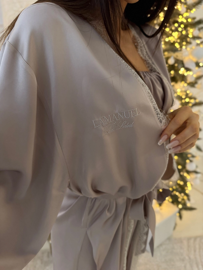 Szlafrok, który wygląda jak luksus – i dokładnie taki jest. Wykonany z wysokogatunkowej, naturalnej wiskozy o satynowym wykończeniu, gwarantuje nie tylko wyjątkową miękkość, ale też przewiewność i komfort noszenia. Tkanina pięknie się układa, subtelnie błyszczy i jest przyjemna dla skóry – nawet tej najbardziej wymagającej. Delikatna koronka i haftowane logo LAMANUEL podkreślają jego wyrafinowany charakter. To produkt klasy premium, który robi wrażenie – od materiału po każdy detal. Idealny dla kobiety, która wybiera jakość i chce czuć się wyjątkowo – codziennie.Skład: 100% wiskoza satyna
