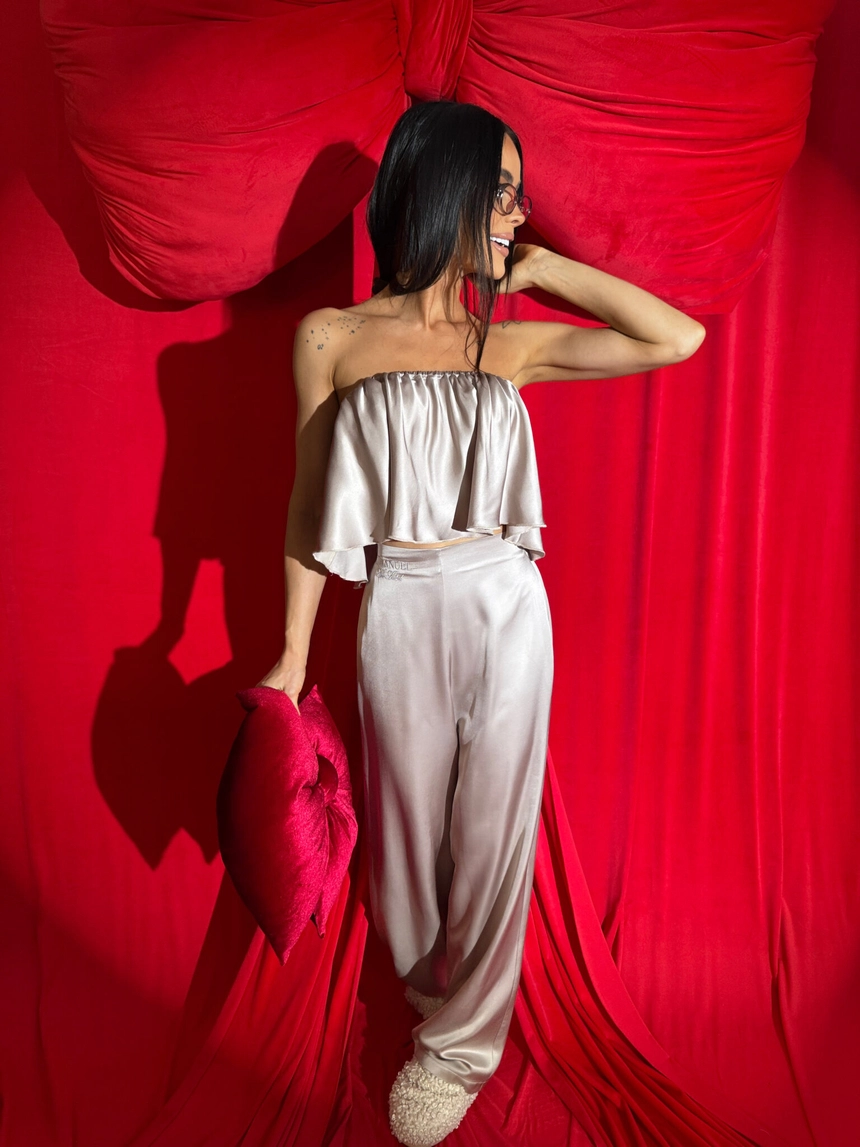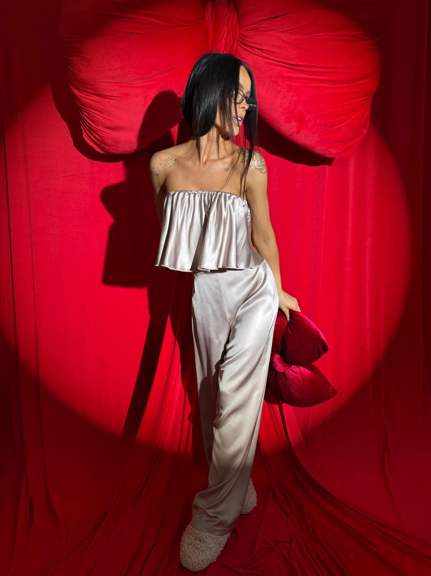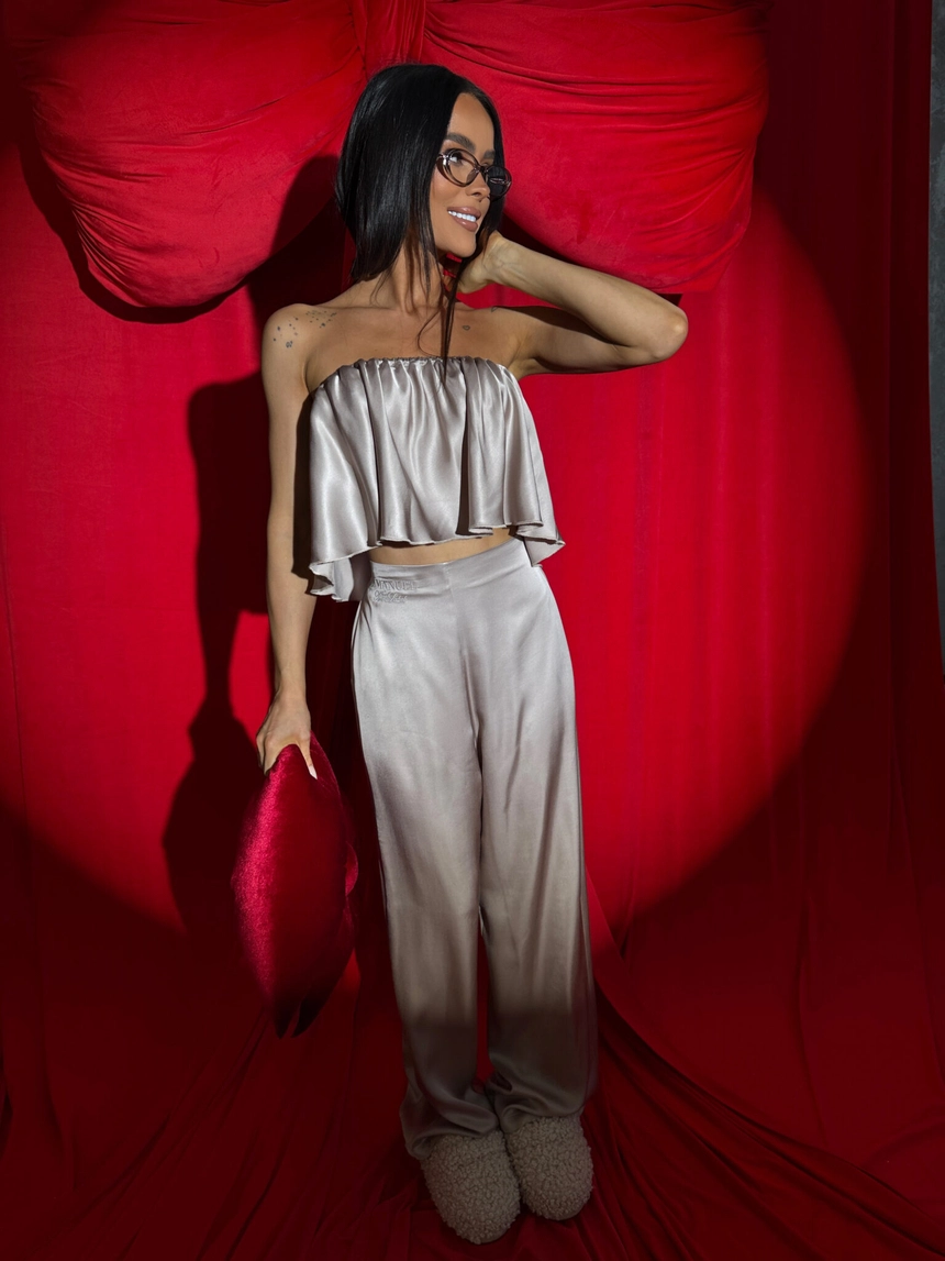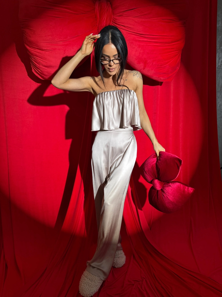 Ten komplet to kwintesencja luksusu w domowej odsłonie. Wykonany z naturalnej wiskozy o satynowym wykończeniu, zachwyca miękkością, subtelnym połyskiem i eleganckim ruchem tkaniny przy każdym kroku. Top bez ramiączek z falbaną delikatnie podkreśla ramiona, a szerokie spodnie z wysokim stanem i efektownym marszczeniem z tyłu pięknie układają się na sylwetce – zwłaszcza na biodrach i pośladkach.To nie tylko komplet do domu. To styl, który możesz śmiało zabrać na wieczór, do hotelu, na prezent. Klasa, jakość i dopracowany detal – dokładnie tak, jak definiuje to LAMANUEL.Skład: 100% wiskoza satyna