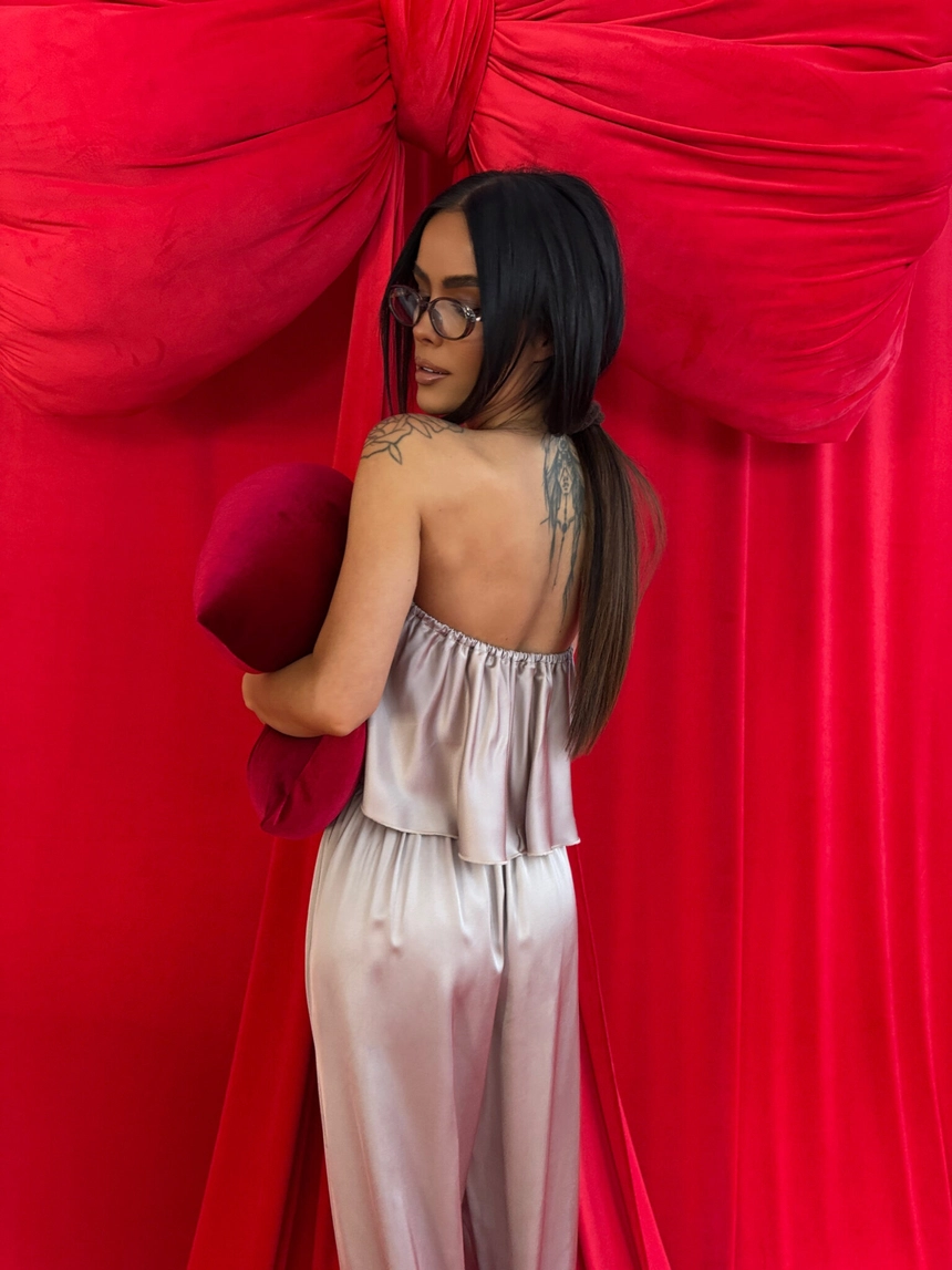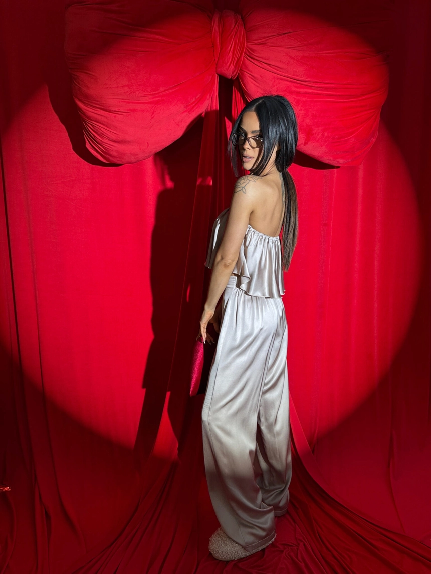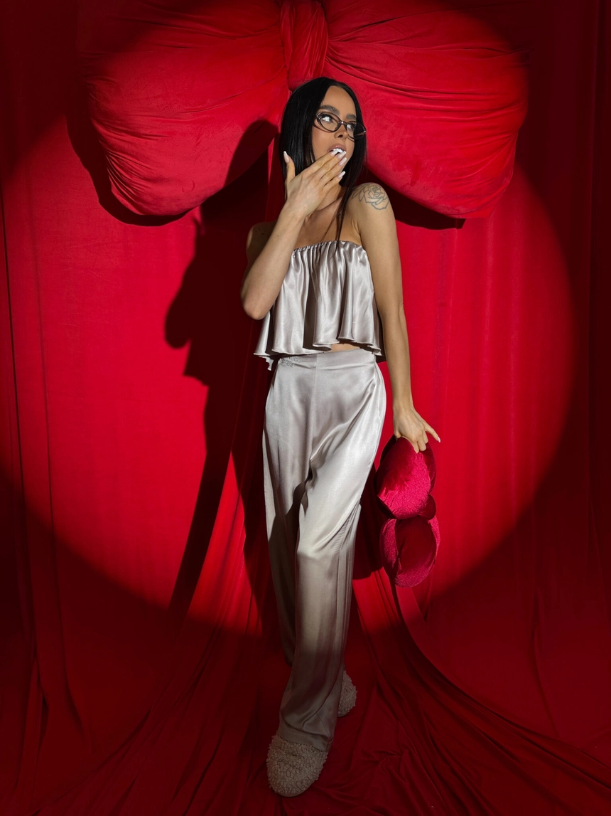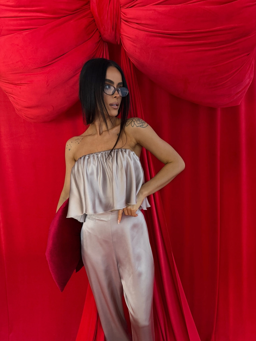 Ten komplet to kwintesencja luksusu w domowej odsłonie. Wykonany z naturalnej wiskozy o satynowym wykończeniu, zachwyca miękkością, subtelnym połyskiem i eleganckim ruchem tkaniny przy każdym kroku. Top bez ramiączek z falbaną delikatnie podkreśla ramiona, a szerokie spodnie z wysokim stanem i efektownym marszczeniem z tyłu pięknie układają się na sylwetce – zwłaszcza na biodrach i pośladkach.To nie tylko komplet do domu. To styl, który możesz śmiało zabrać na wieczór, do hotelu, na prezent. Klasa, jakość i dopracowany detal – dokładnie tak, jak definiuje to LAMANUEL.Skład: 100% wiskoza satyna