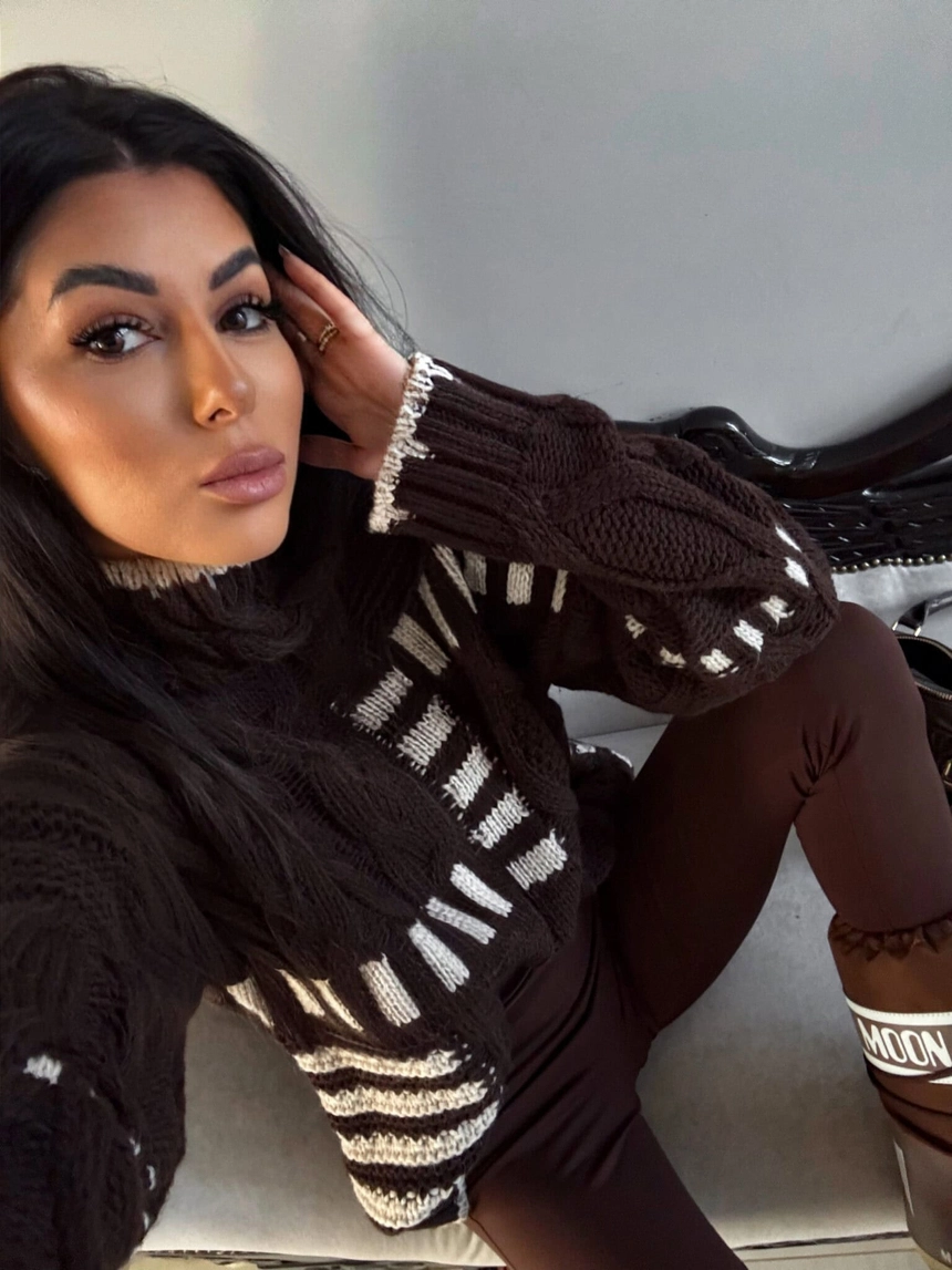Sweter zakładany przez głowę, wykonany z miękkiej dzianiny o efektownym splocie warkoczowym. Posiada ściągacz przy dekolcie, na dole oraz przy mankietach, co zapewnia wygodne dopasowanie. Luźny, lekko oversize’owy krój, gwarantuje swobodę ruchów. Idealny wybór na chłodniejsze dni – łączy komfort, ciepło i modny design.
