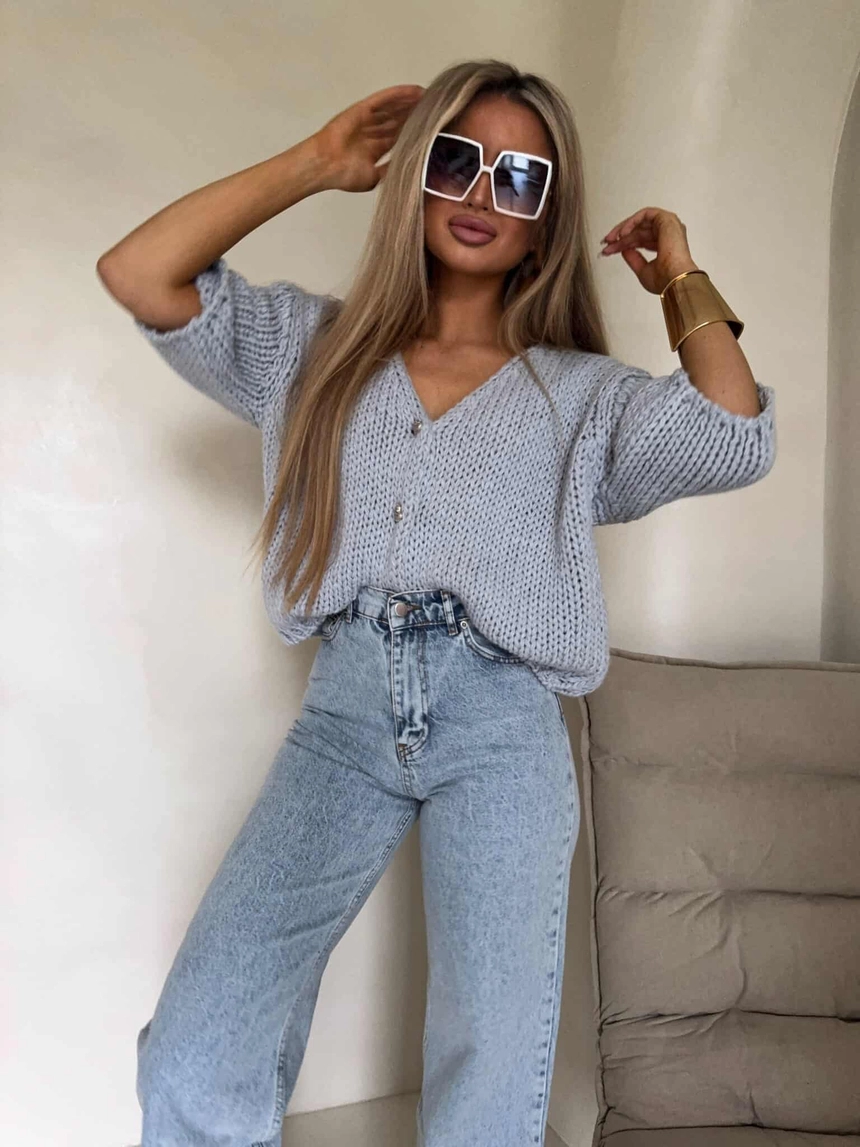 Luźny kardigan o oversizowym kroju, wykonany z miękkiej, przyjemnej w dotyku dzianiny. Model z krótkim rękawem oraz dekoltem w kształcie litery V, który subtelnie podkreśla sylwetkę. Zapinany na ozdobne guziki, stanowiące stylowy akcent całości.