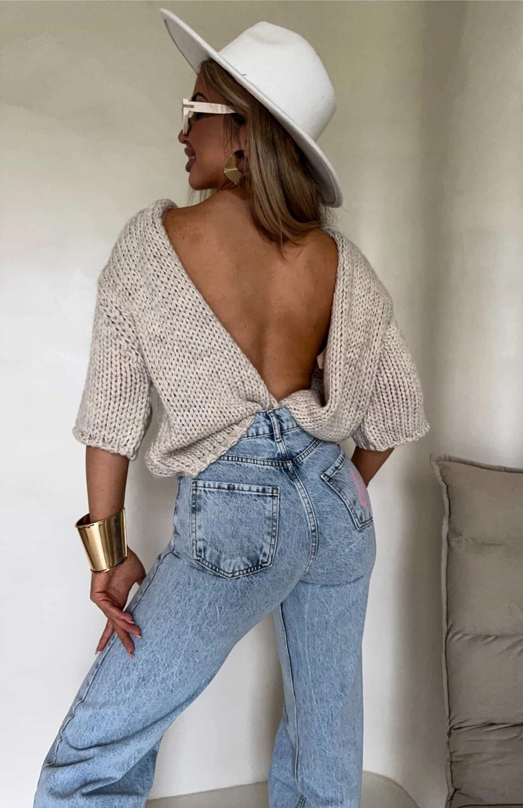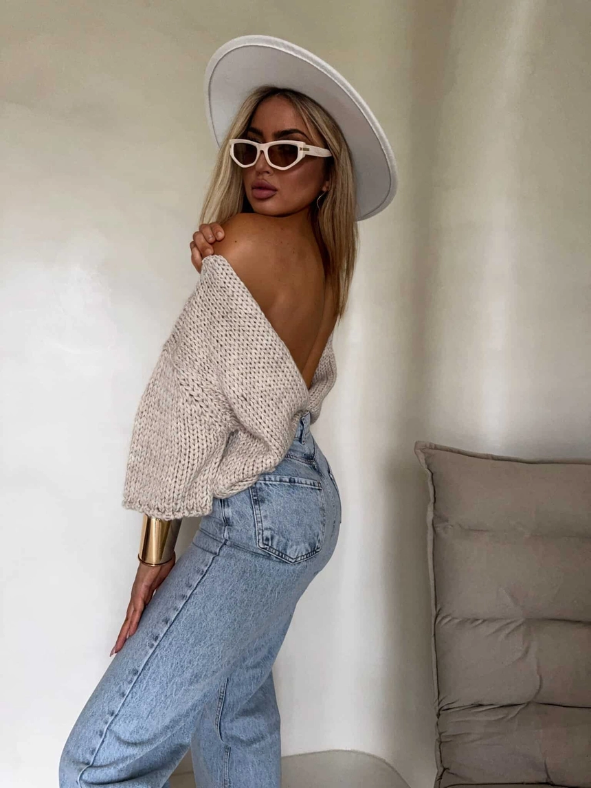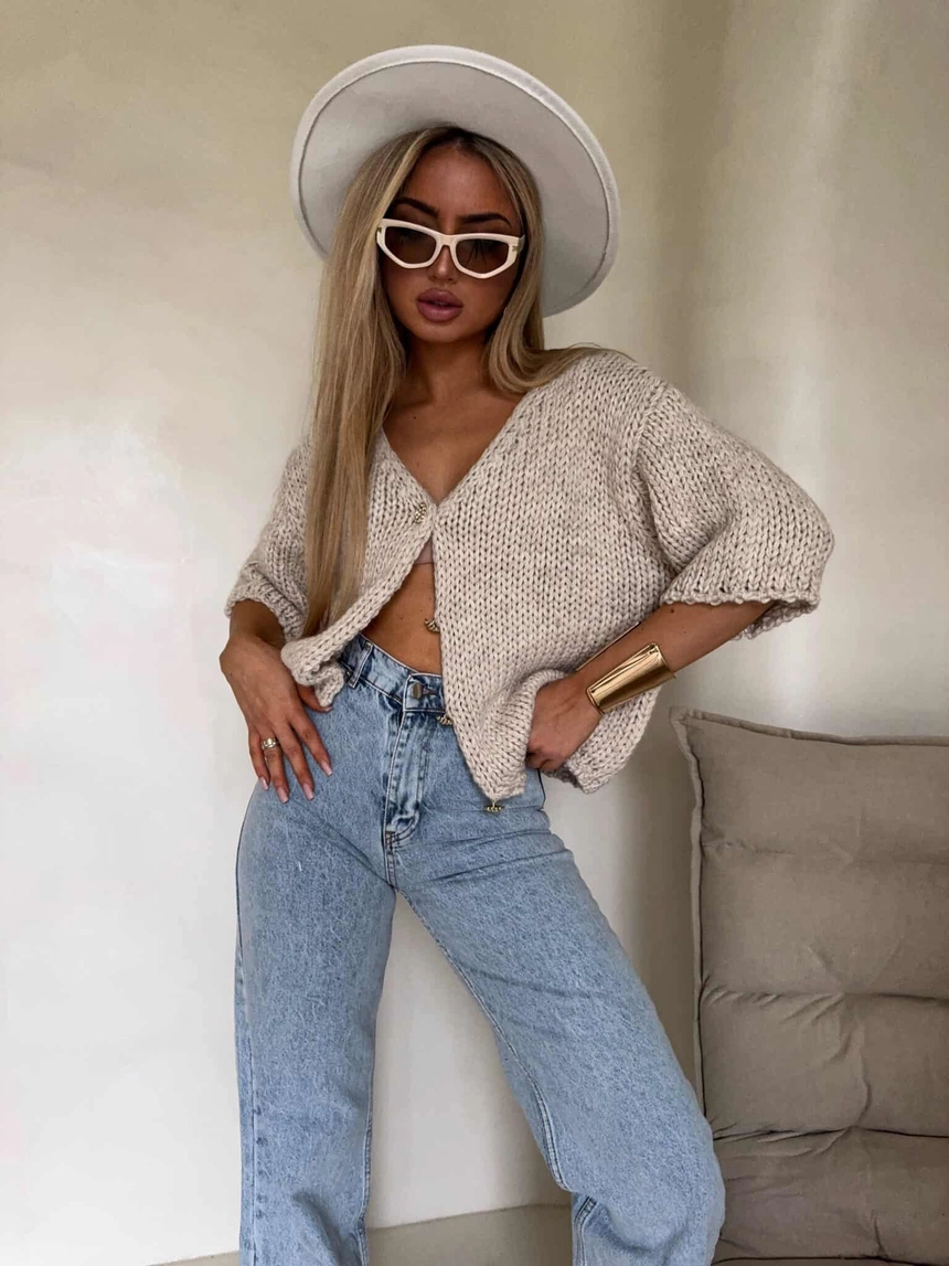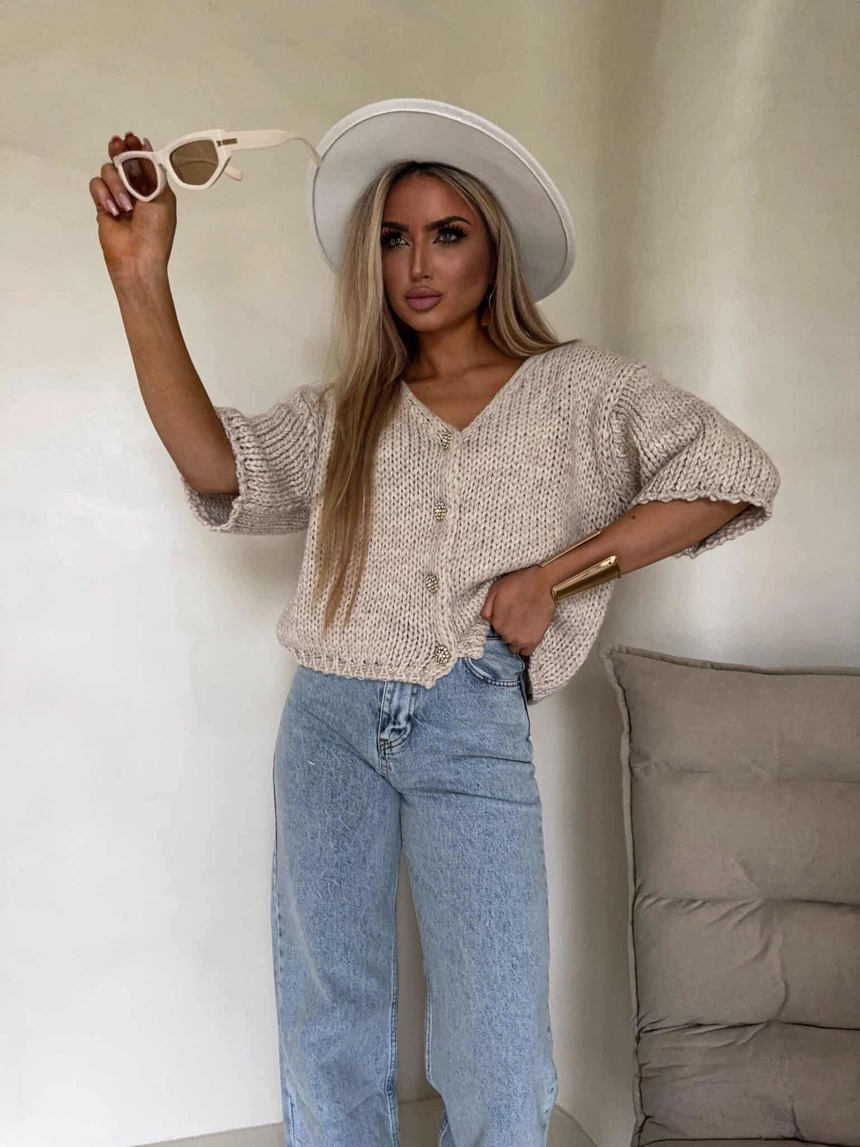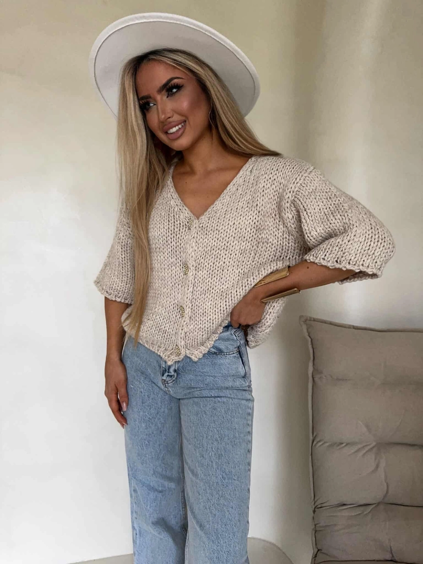 Luźny kardigan o oversizowym kroju, wykonany z miękkiej, przyjemnej w dotyku dzianiny. Model z krótkim rękawem oraz dekoltem w kształcie litery V, który subtelnie podkreśla sylwetkę. Zapinany na ozdobne guziki, stanowiące stylowy akcent całości.