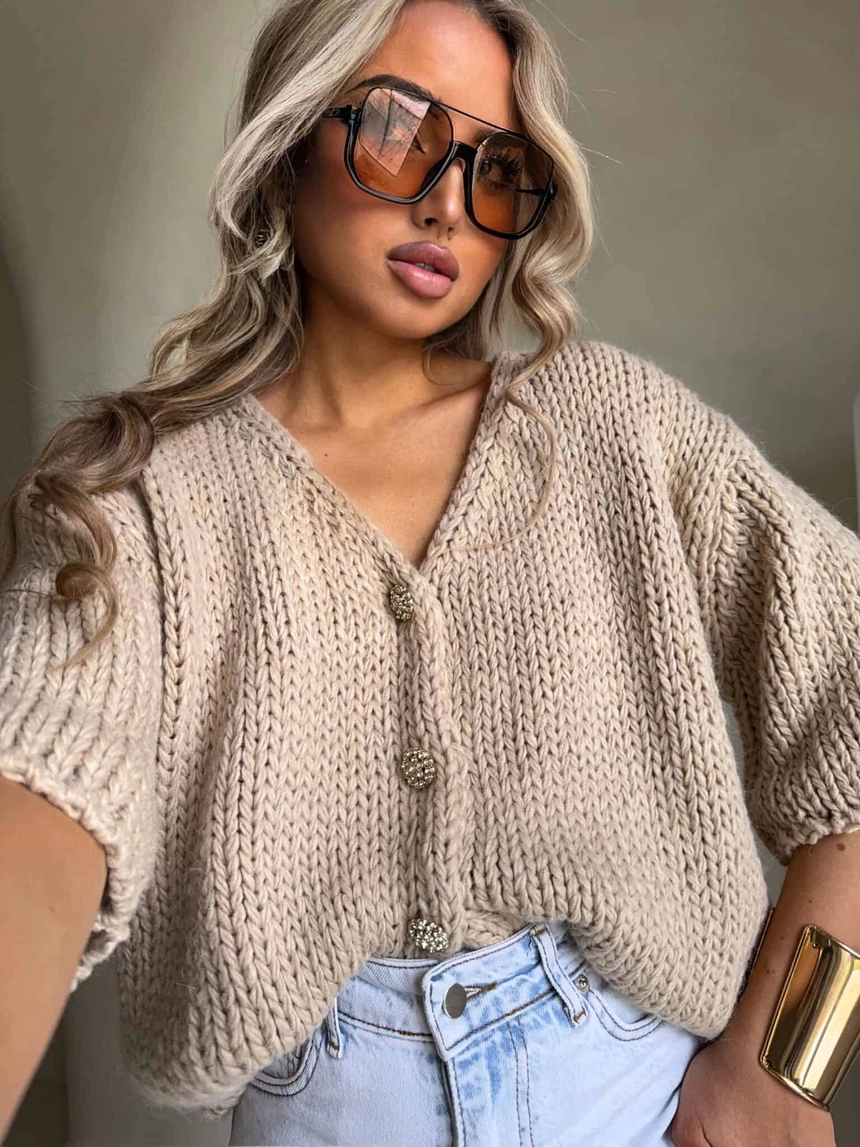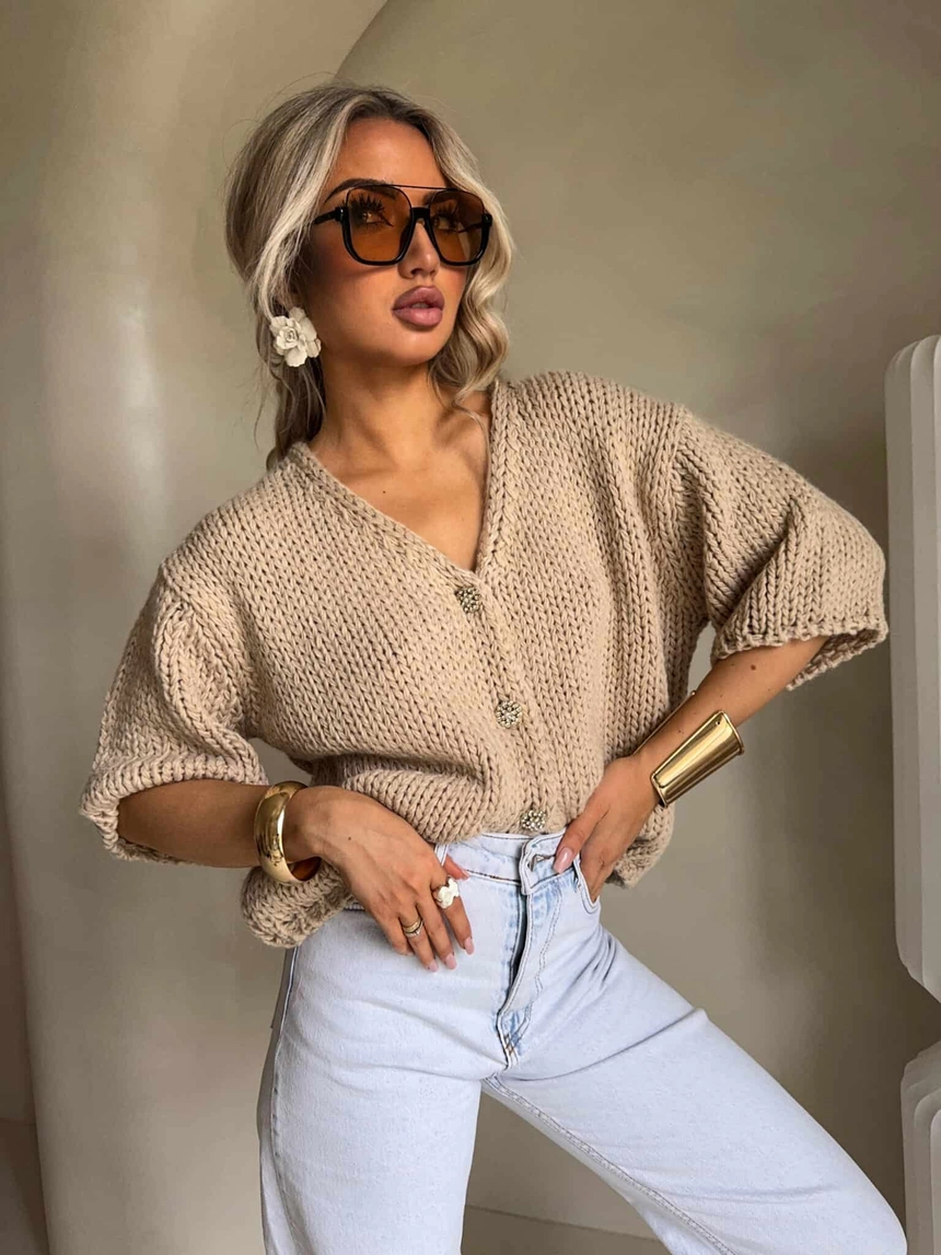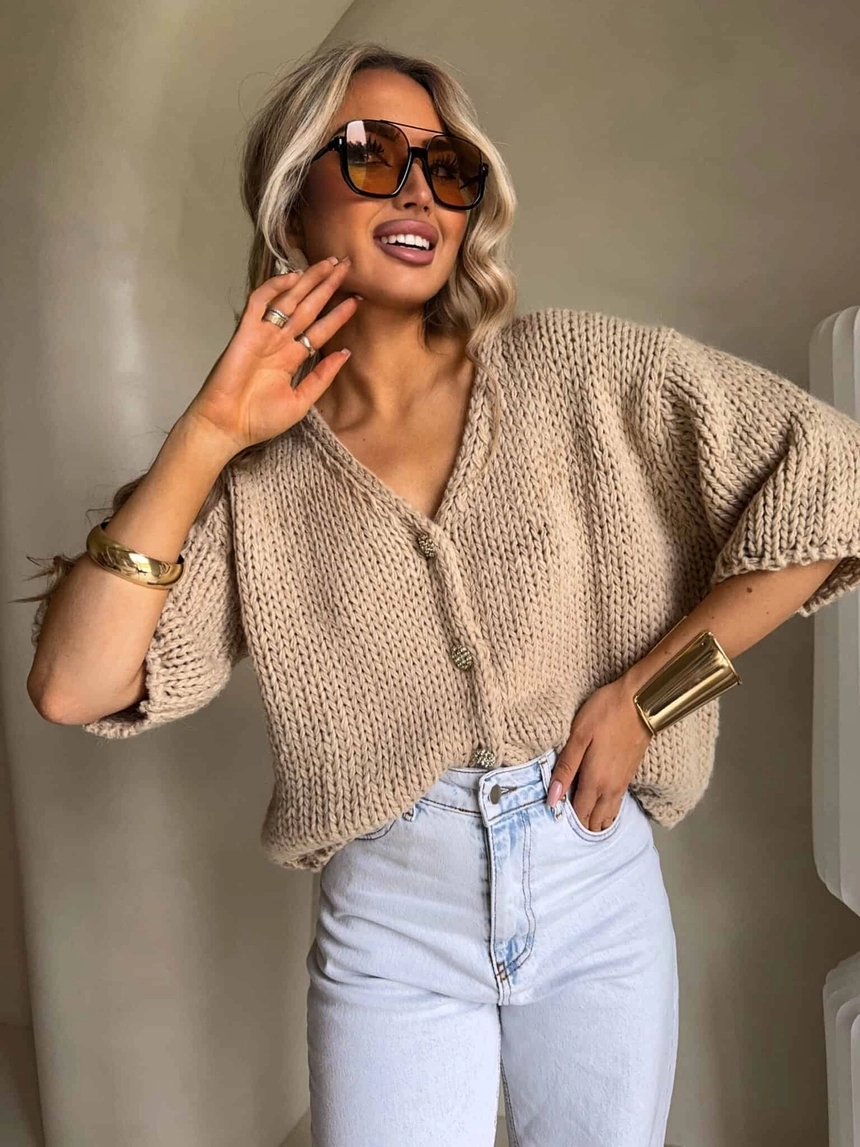 Luźny kardigan o oversizowym kroju, wykonany z miękkiej, przyjemnej w dotyku dzianiny. Model z krótkim rękawem oraz dekoltem w kształcie litery V, który subtelnie podkreśla sylwetkę. Zapinany na ozdobne guziki, stanowiące stylowy akcent całości.