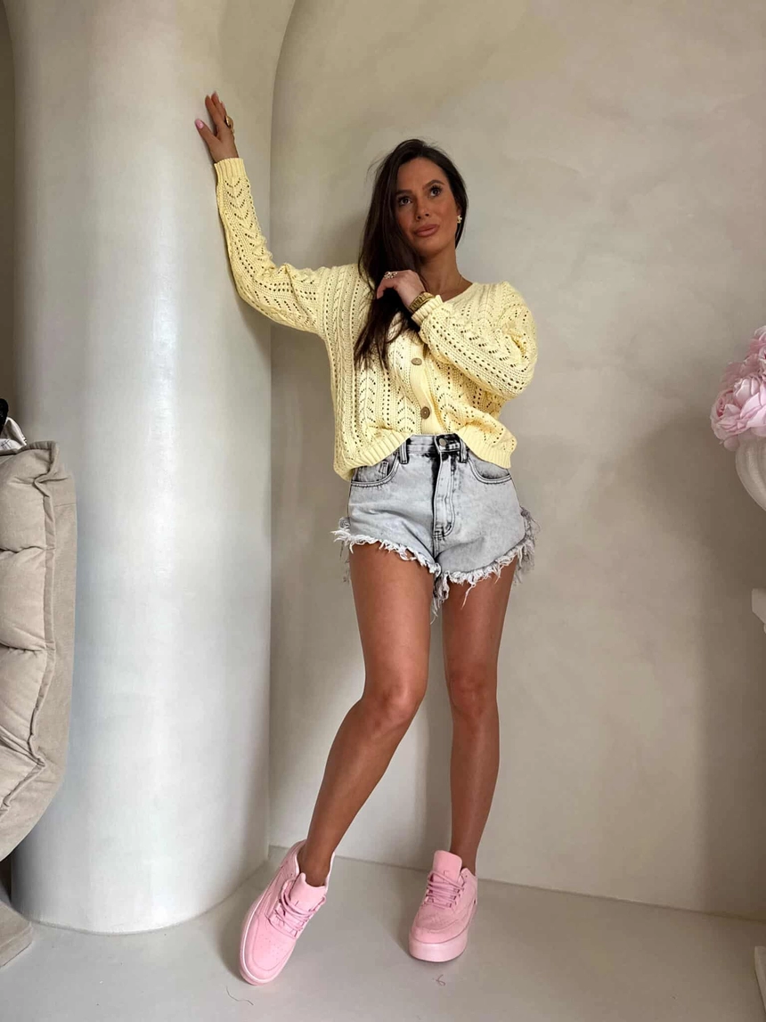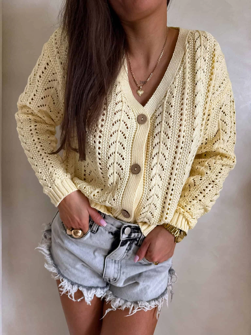 Sweter z dzianiny o ażurowym, dekoracyjnym splocie, który nadaje całości lekkości i subtelnego charakteru. Model o krótkim fasonie z dekoltem w serek, zapinany z przodu na stylowe drewniane guziki. Długie rękawy zakończone są ściągaczami, podobnie jak dół swetra.