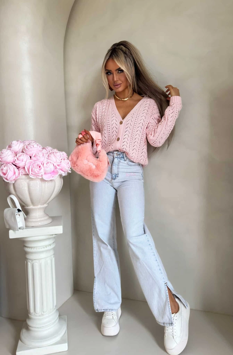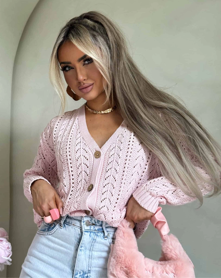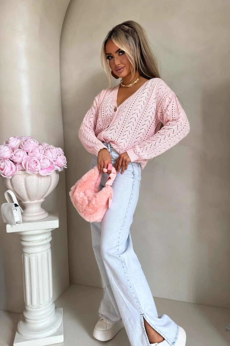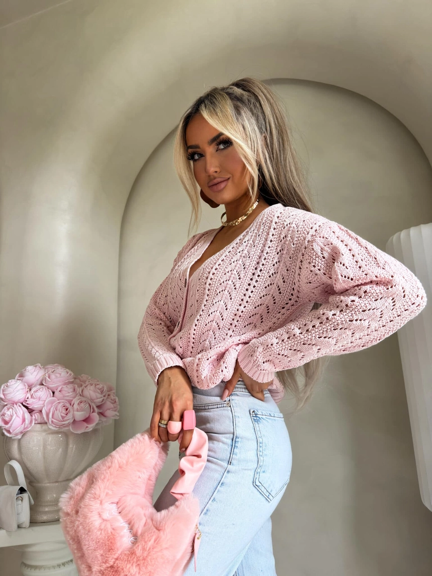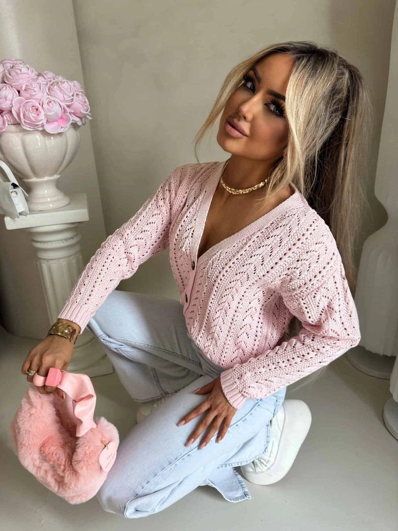 Sweter z dzianiny o ażurowym, dekoracyjnym splocie, który nadaje całości lekkości i subtelnego charakteru. Model o krótkim fasonie z dekoltem w serek, zapinany z przodu na stylowe drewniane guziki. Długie rękawy zakończone są ściągaczami, podobnie jak dół swetra.