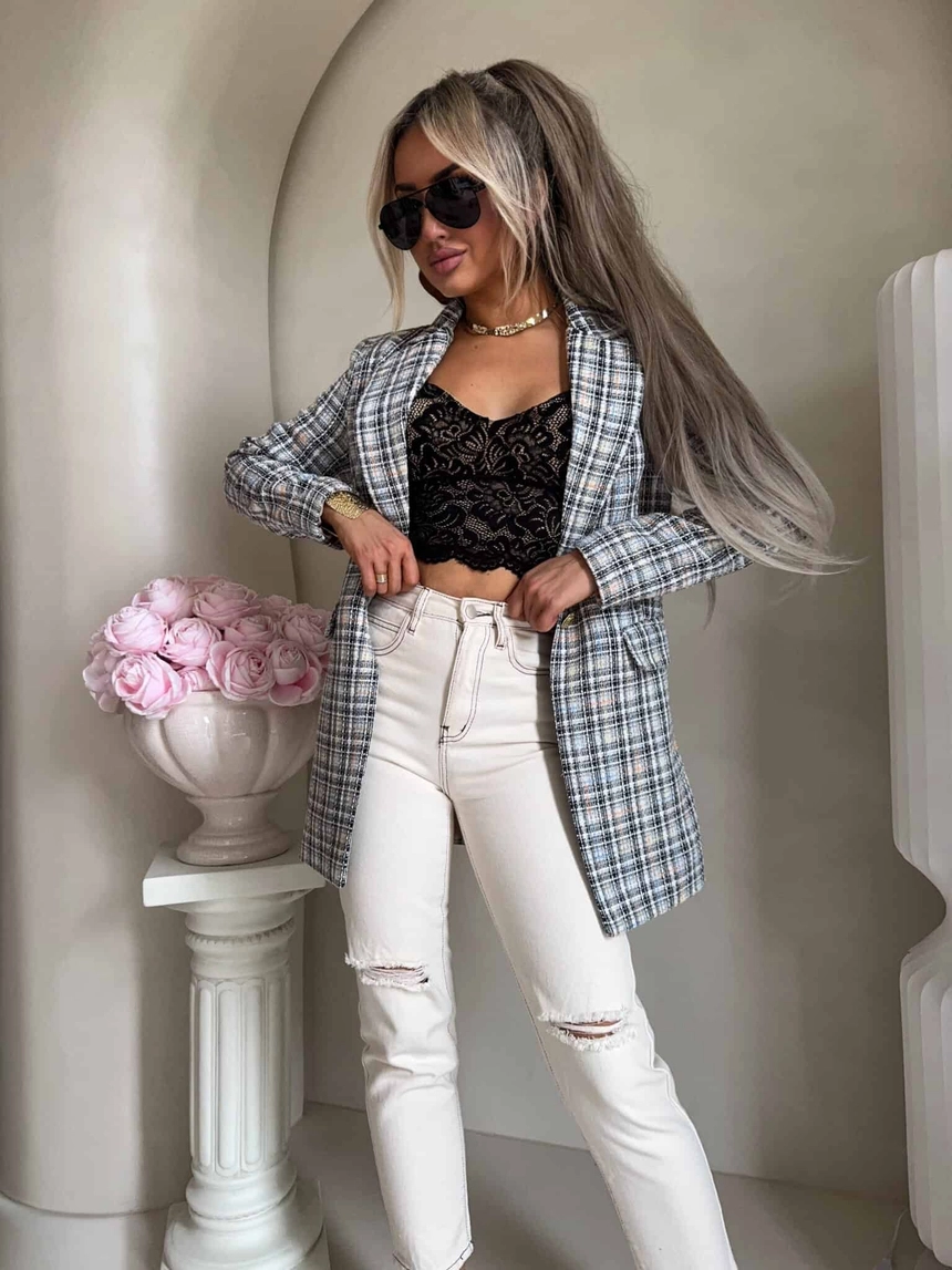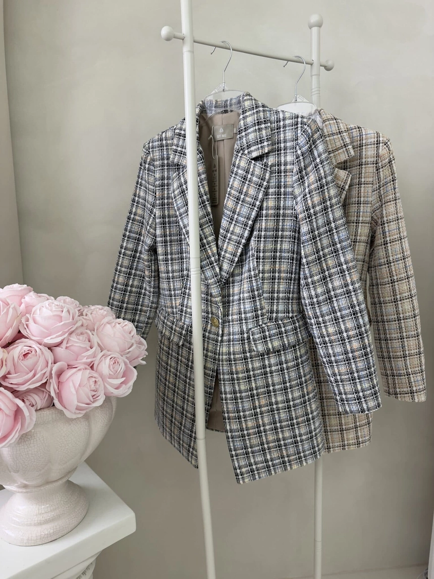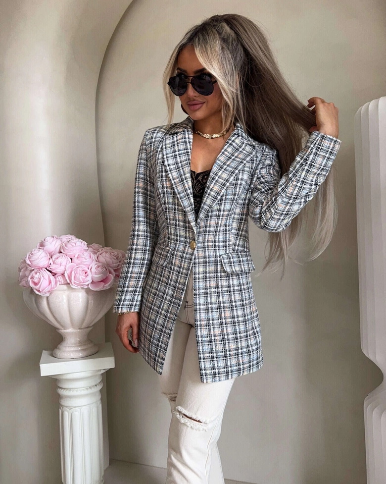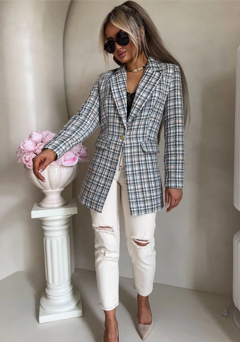 Marynarka o klasycznym, eleganckim fasonie. Jest delikatnie dopasowana w talii, dzięki czemu subtelnie podkreśla sylwetkę. Posiada jednorzędowe zapięcie na jeden guzik oraz klasyczne klapy o średniej szerokości. Po bokach znajdują się dwie kieszenie z patkami. Długość marynarki sięga poniżej bioder, co zapewnia eleganckie proporcje. Długie rękawy mają prosty krój.