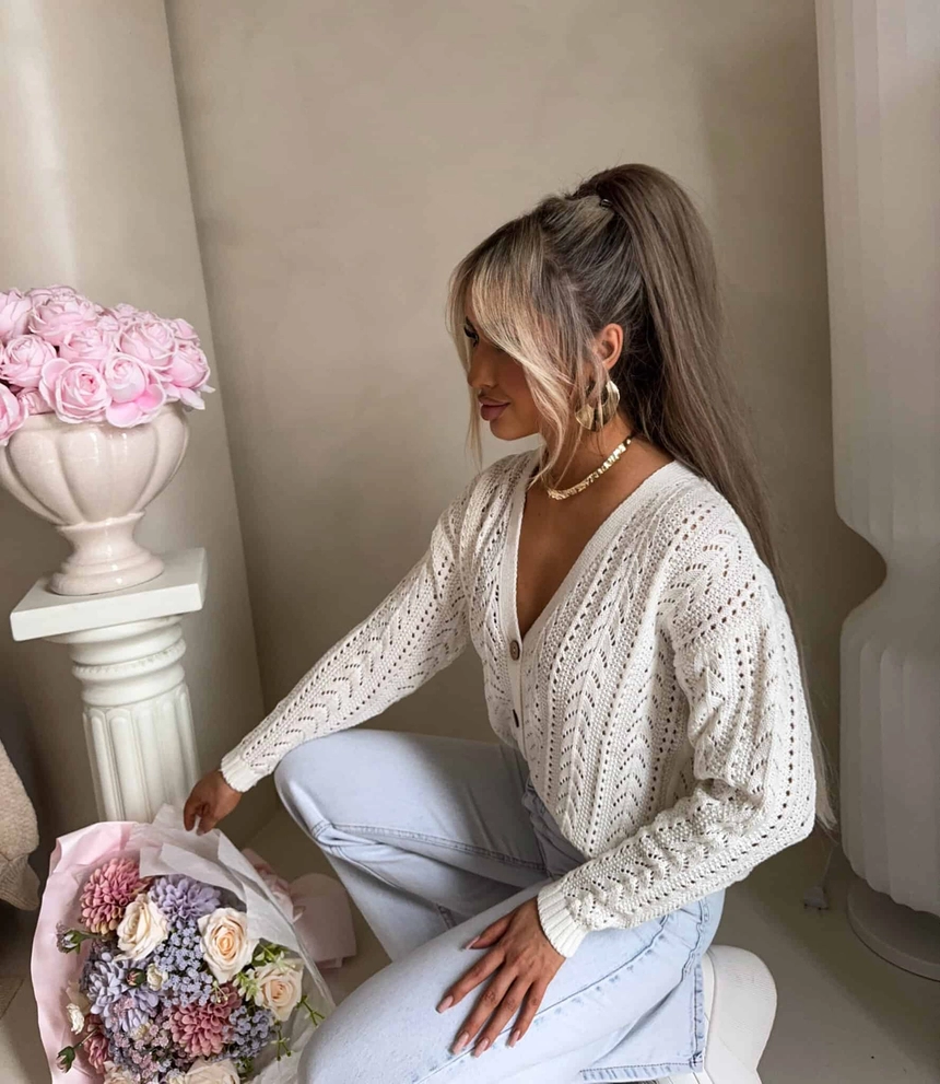 Sweter z dzianiny o ażurowym, dekoracyjnym splocie, który nadaje całości lekkości i subtelnego charakteru. Model o krótkim fasonie z dekoltem w serek, zapinany z przodu na stylowe drewniane guziki. Długie rękawy zakończone są ściągaczami, podobnie jak dół swetra.