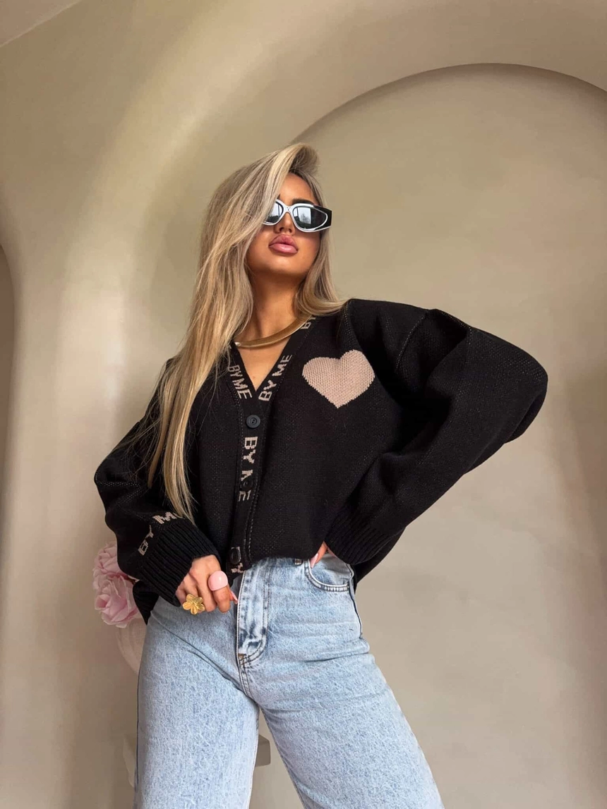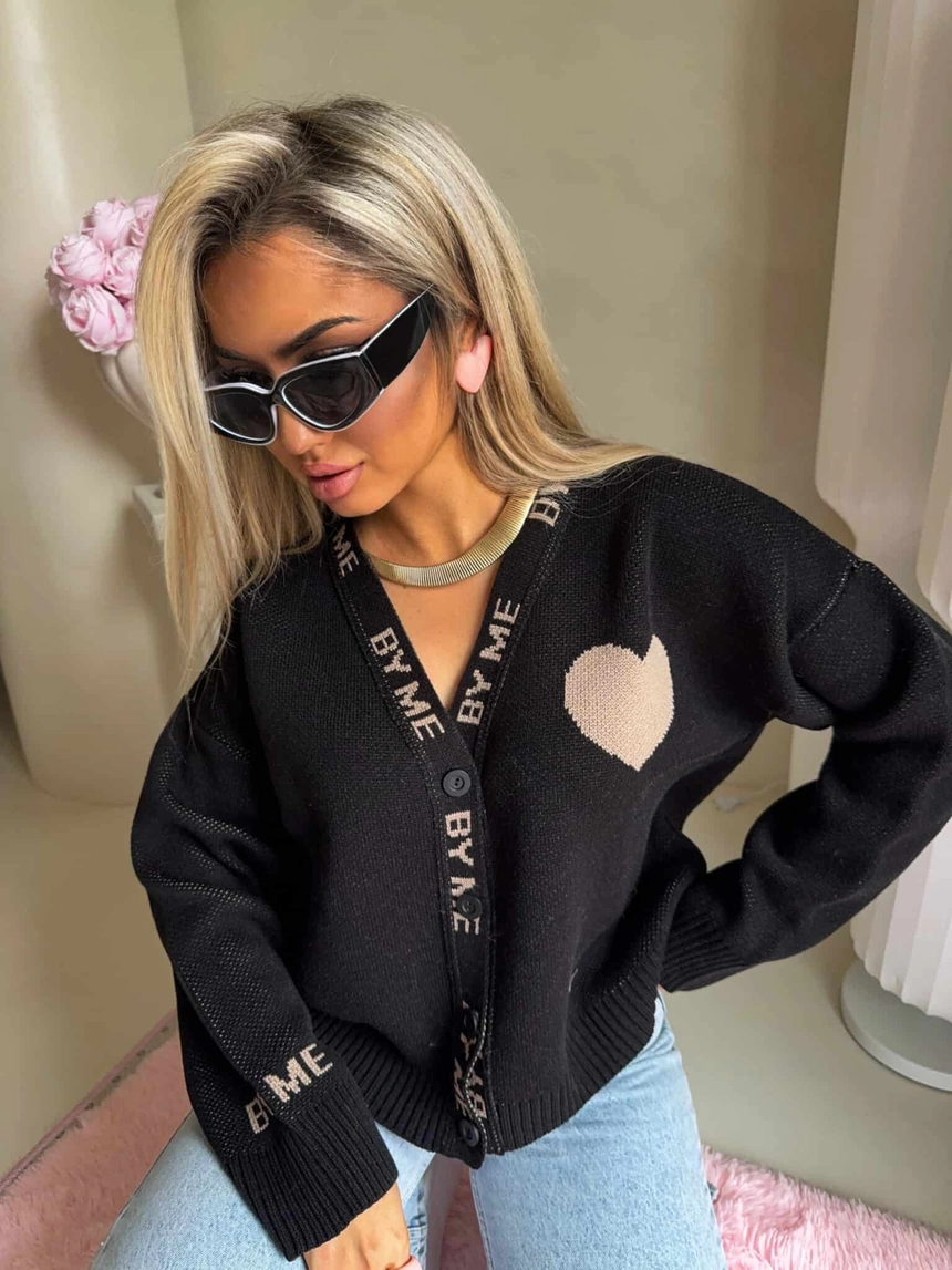 Luźny sweter o oversize’owym kroju, zapinany na guziki. Model posiada dekolt w kształcie litery V oraz długie rękawy zakończone ściągaczami – podobnie jak dół swetra – co zapewnia dobre dopasowanie i komfort noszenia. Wyrazistym akcentem są dekoracyjne napisy biegnące wzdłuż listwy z guzikami oraz na rękawach. Całość uzupełnia urocza naszywka w kształcie serca umieszczona na ramieniu