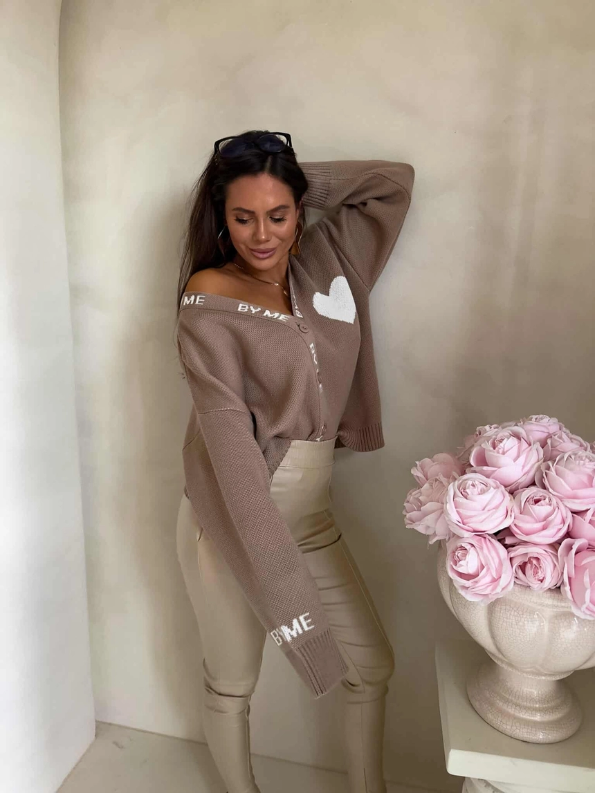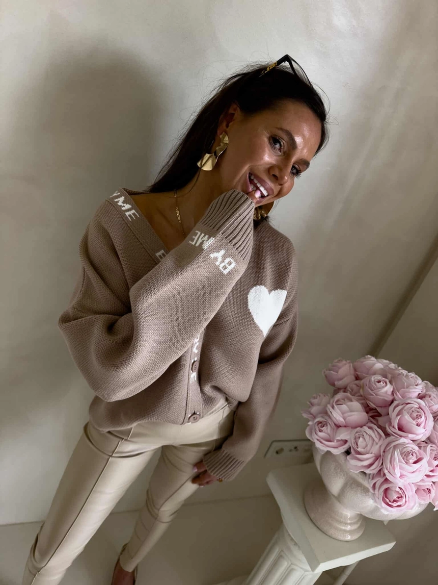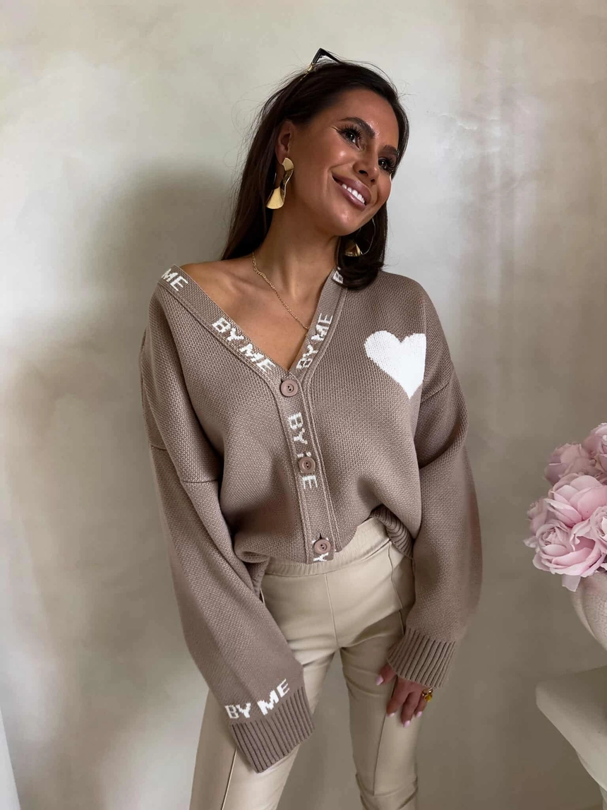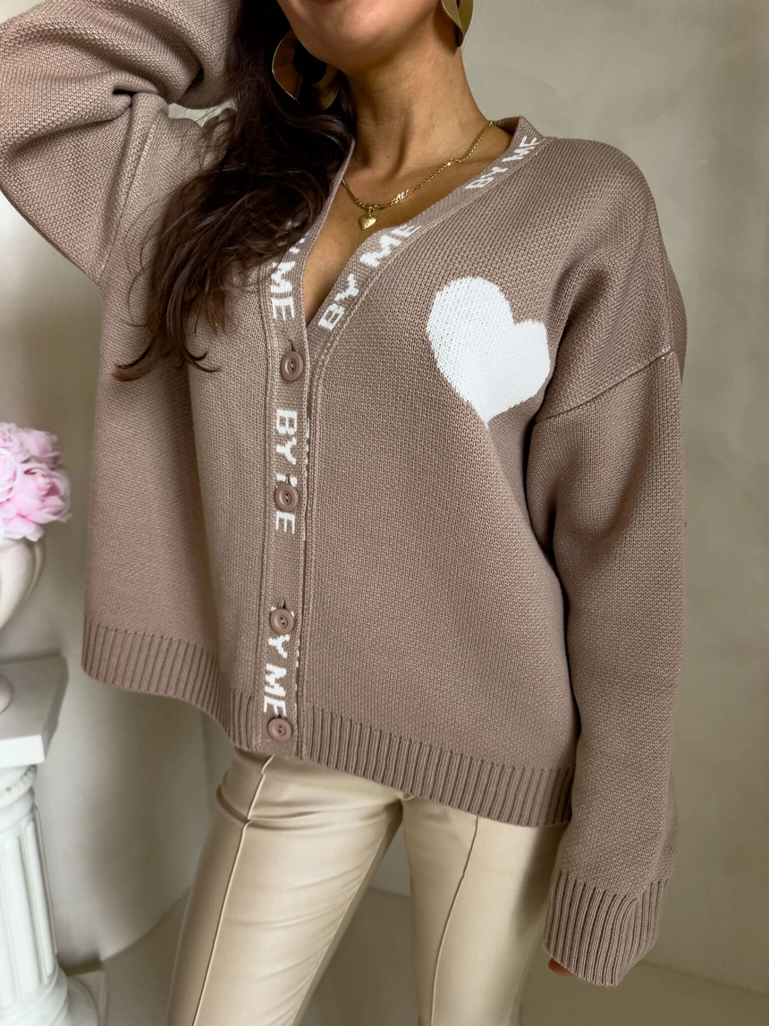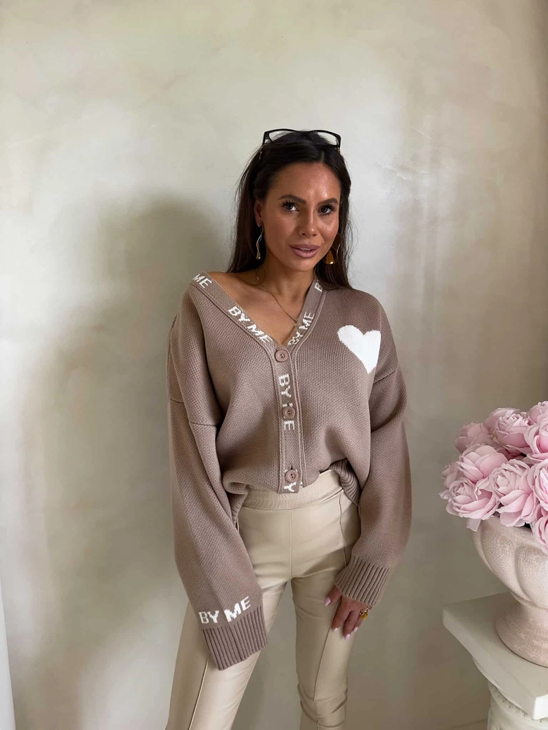 Luźny sweter o oversize’owym kroju, zapinany na guziki. Model posiada dekolt w kształcie litery V oraz długie rękawy zakończone ściągaczami – podobnie jak dół swetra – co zapewnia dobre dopasowanie i komfort noszenia. Wyrazistym akcentem są dekoracyjne napisy biegnące wzdłuż listwy z guzikami oraz na rękawach. Całość uzupełnia urocza naszywka w kształcie serca umieszczona na ramieniu