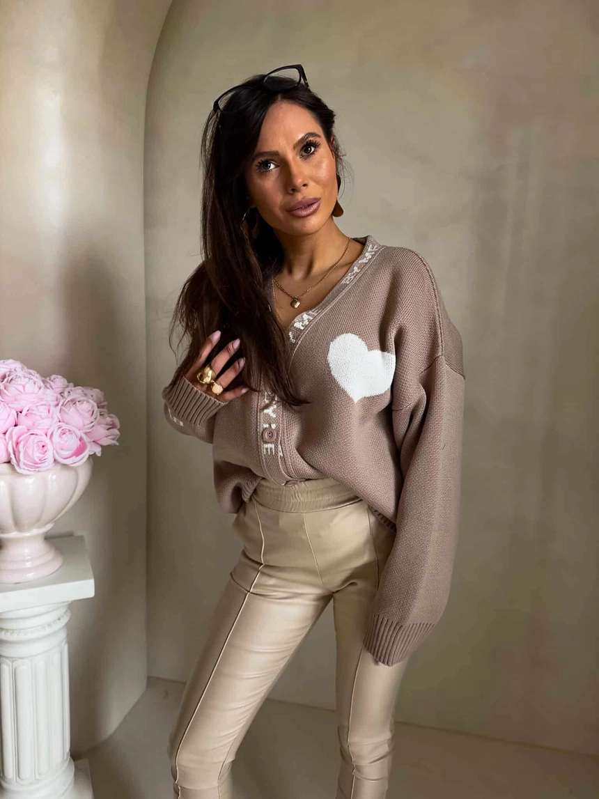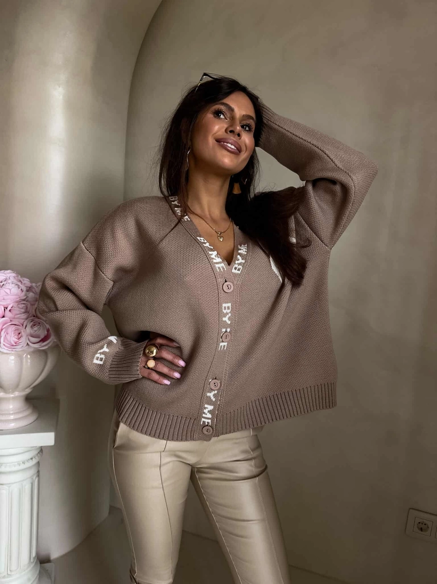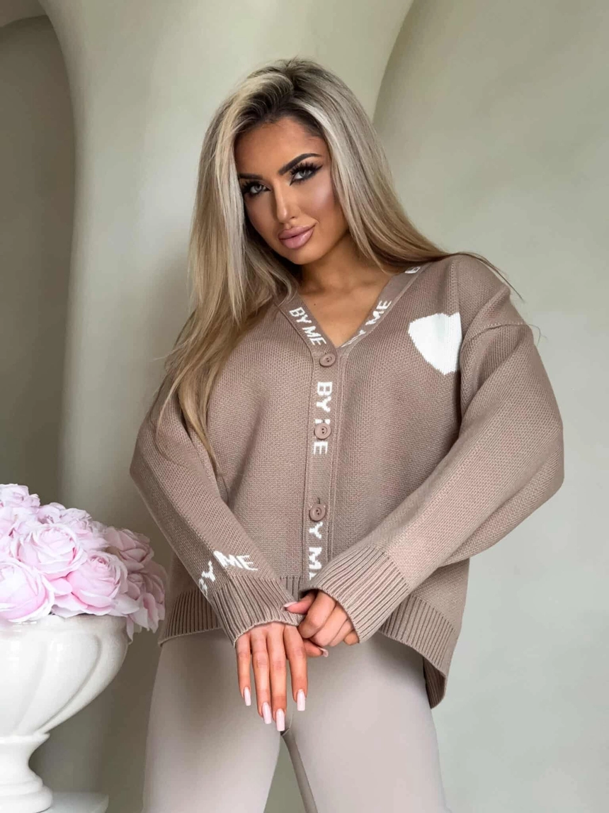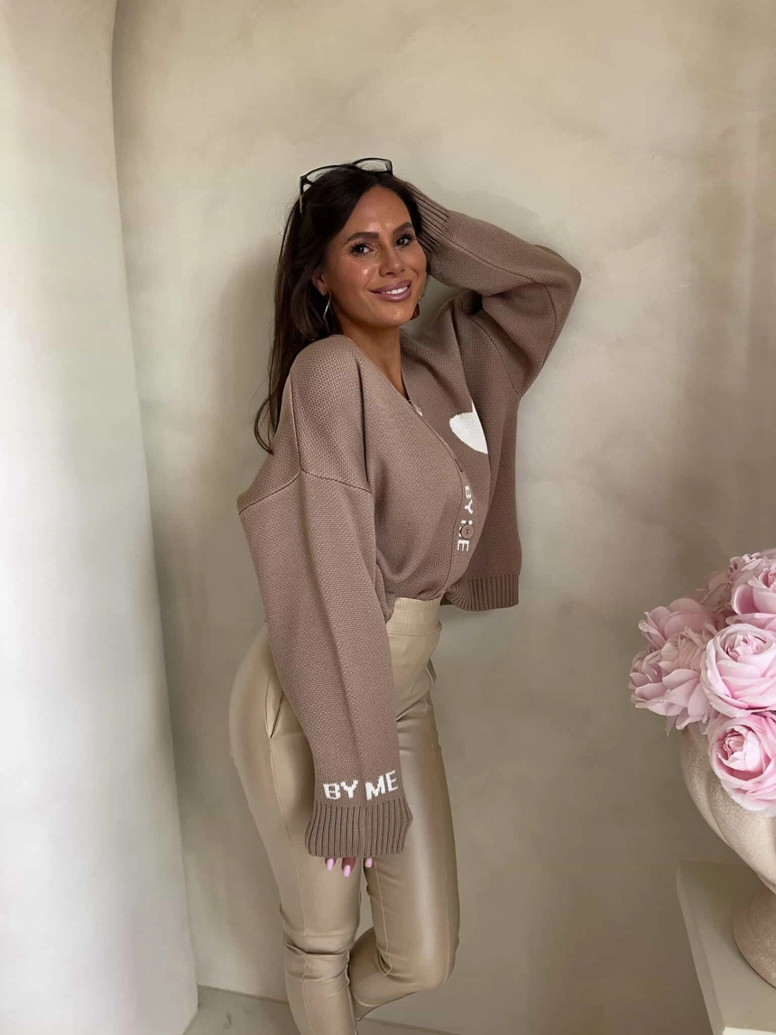 Luźny sweter o oversize’owym kroju, zapinany na guziki. Model posiada dekolt w kształcie litery V oraz długie rękawy zakończone ściągaczami – podobnie jak dół swetra – co zapewnia dobre dopasowanie i komfort noszenia. Wyrazistym akcentem są dekoracyjne napisy biegnące wzdłuż listwy z guzikami oraz na rękawach. Całość uzupełnia urocza naszywka w kształcie serca umieszczona na ramieniu