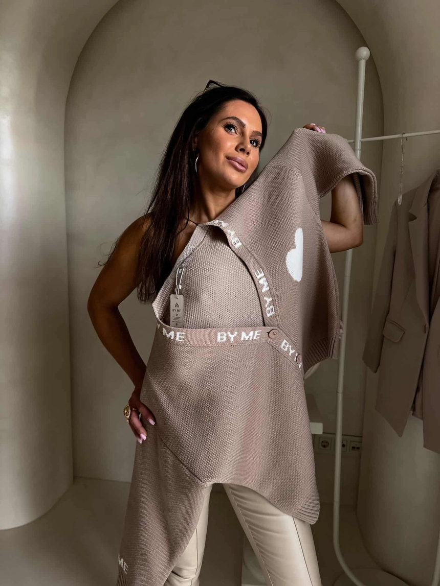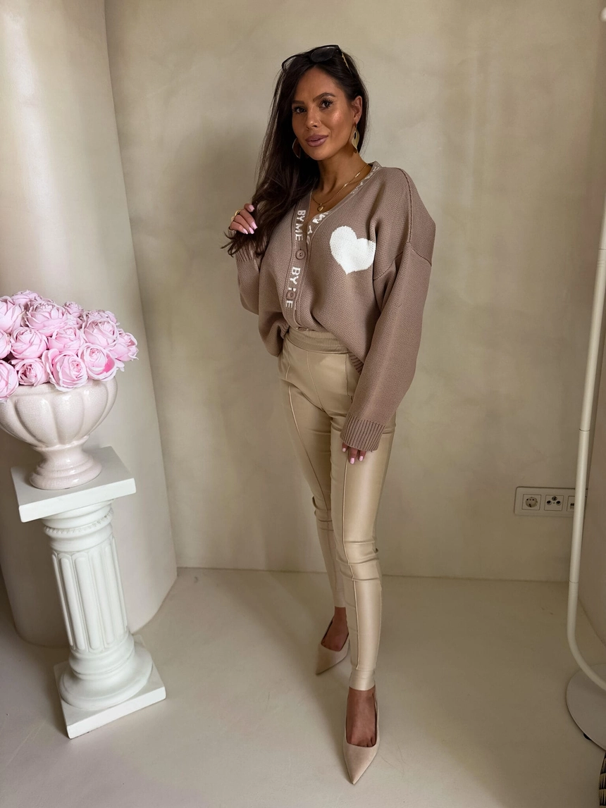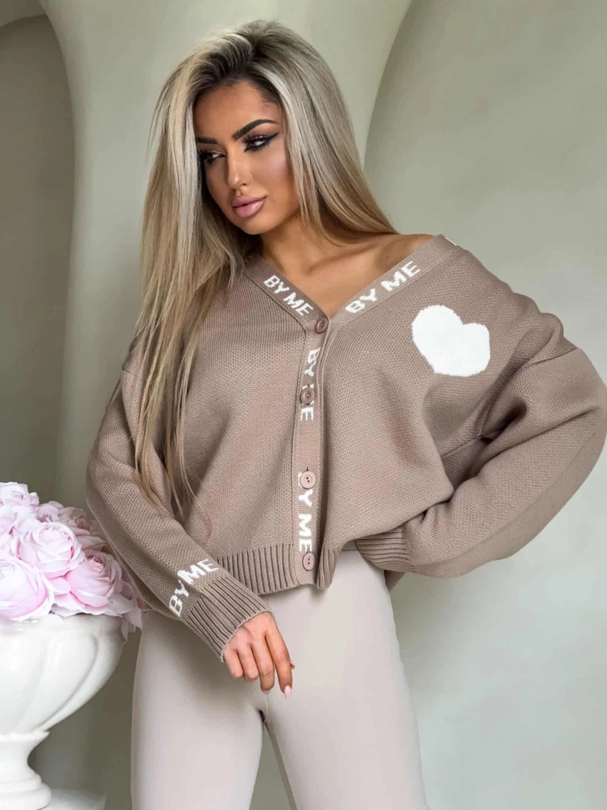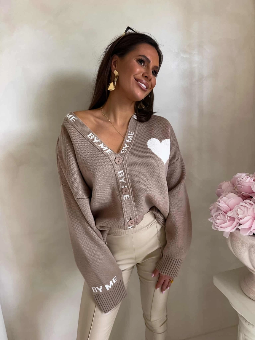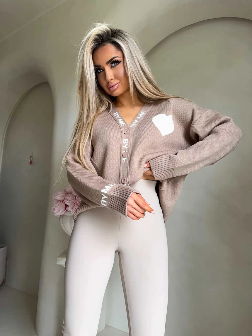Luźny sweter o oversize’owym kroju, zapinany na guziki. Model posiada dekolt w kształcie litery V oraz długie rękawy zakończone ściągaczami – podobnie jak dół swetra – co zapewnia dobre dopasowanie i komfort noszenia. Wyrazistym akcentem są dekoracyjne napisy biegnące wzdłuż listwy z guzikami oraz na rękawach. Całość uzupełnia urocza naszywka w kształcie serca umieszczona na ramieniu