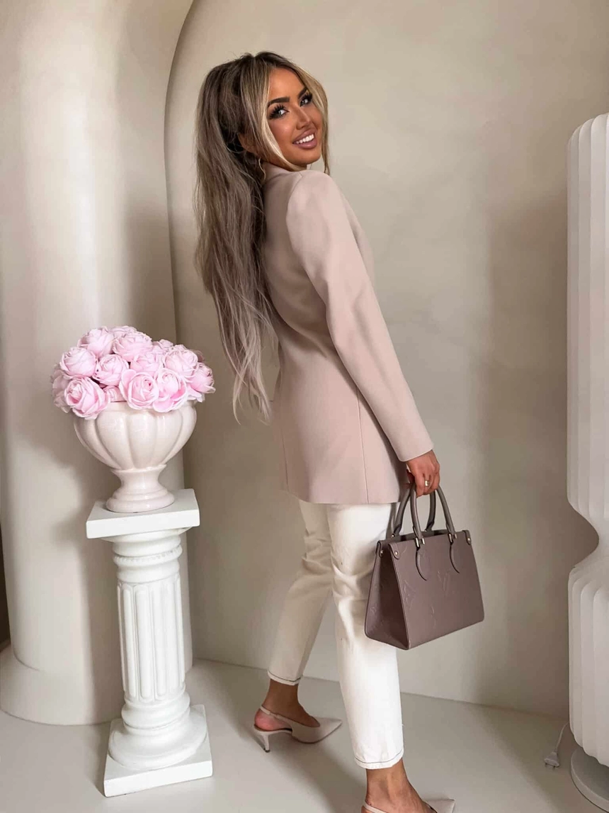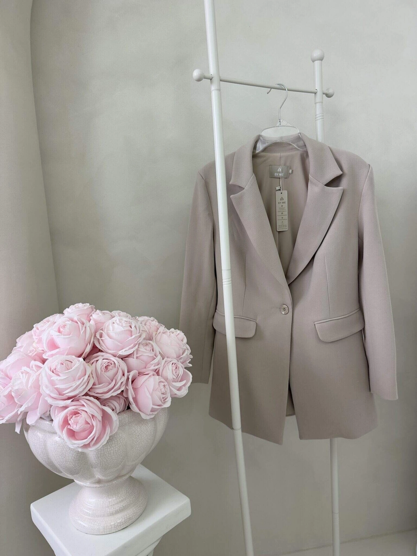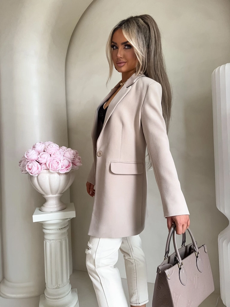 Marynarka o klasycznym, eleganckim fasonie. Jest delikatnie dopasowana w talii, dzięki czemu subtelnie podkreśla sylwetkę. Posiada jednorzędowe zapięcie na jeden guzik oraz klasyczne klapy o średniej szerokości. Po bokach znajdują się dwie kieszenie z patkami. Długość marynarki sięga poniżej bioder, co zapewnia eleganckie proporcje. Długie rękawy mają prosty krój.
