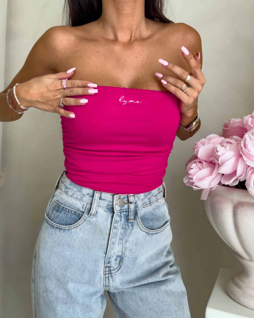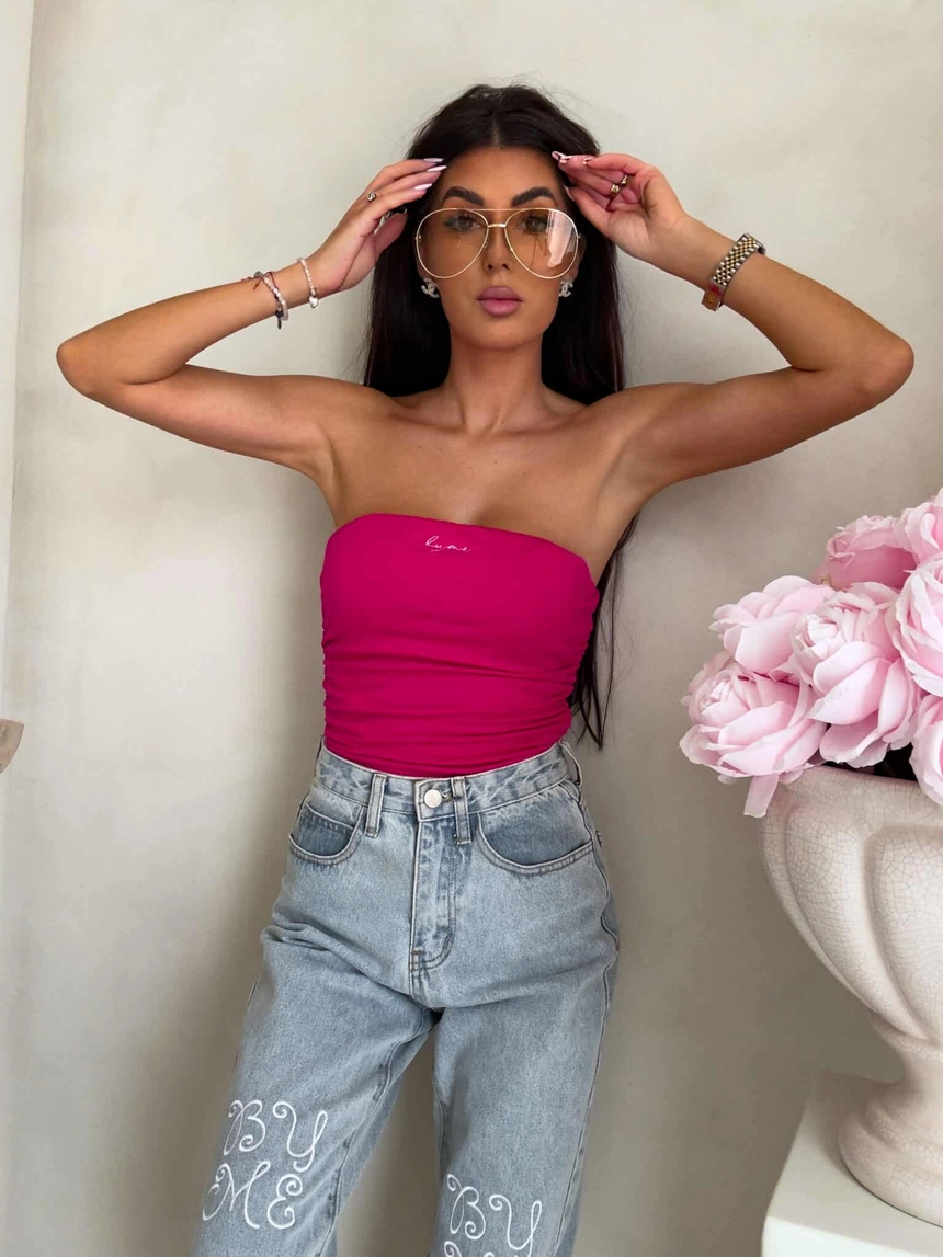 Top logowany bez ramiączek to idealna baza do wielu stylizacji – od codziennych po wieczorowe. Wykonany z elastycznego, idealnie dopasowującego się materiału, gwarantuje komfort noszenia i świetne dopasowanie do sylwetki. Top posiada podwójną warstwę materiału, co zapewnia lepsze krycie i trwałość, a subtelne marszczenia po bokach i z tyłu dodają mu charakteru i delikatnie modelują figurę. Uniwersalny krój sprawia, że będzie świetnie wyglądać zarówno solo, jak i w połączeniu z marynarką czy oversize'ową koszulą.