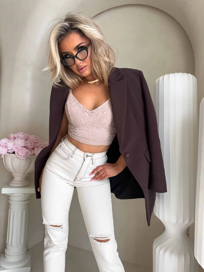 Marynarka o klasycznym, eleganckim fasonie. Jest delikatnie dopasowana w talii, dzięki czemu subtelnie podkreśla sylwetkę. Posiada jednorzędowe zapięcie na jeden guzik oraz klasyczne klapy o średniej szerokości. Po bokach znajdują się dwie kieszenie z patkami. Długość marynarki sięga poniżej bioder, co zapewnia eleganckie proporcje. Długie rękawy mają prosty krój.