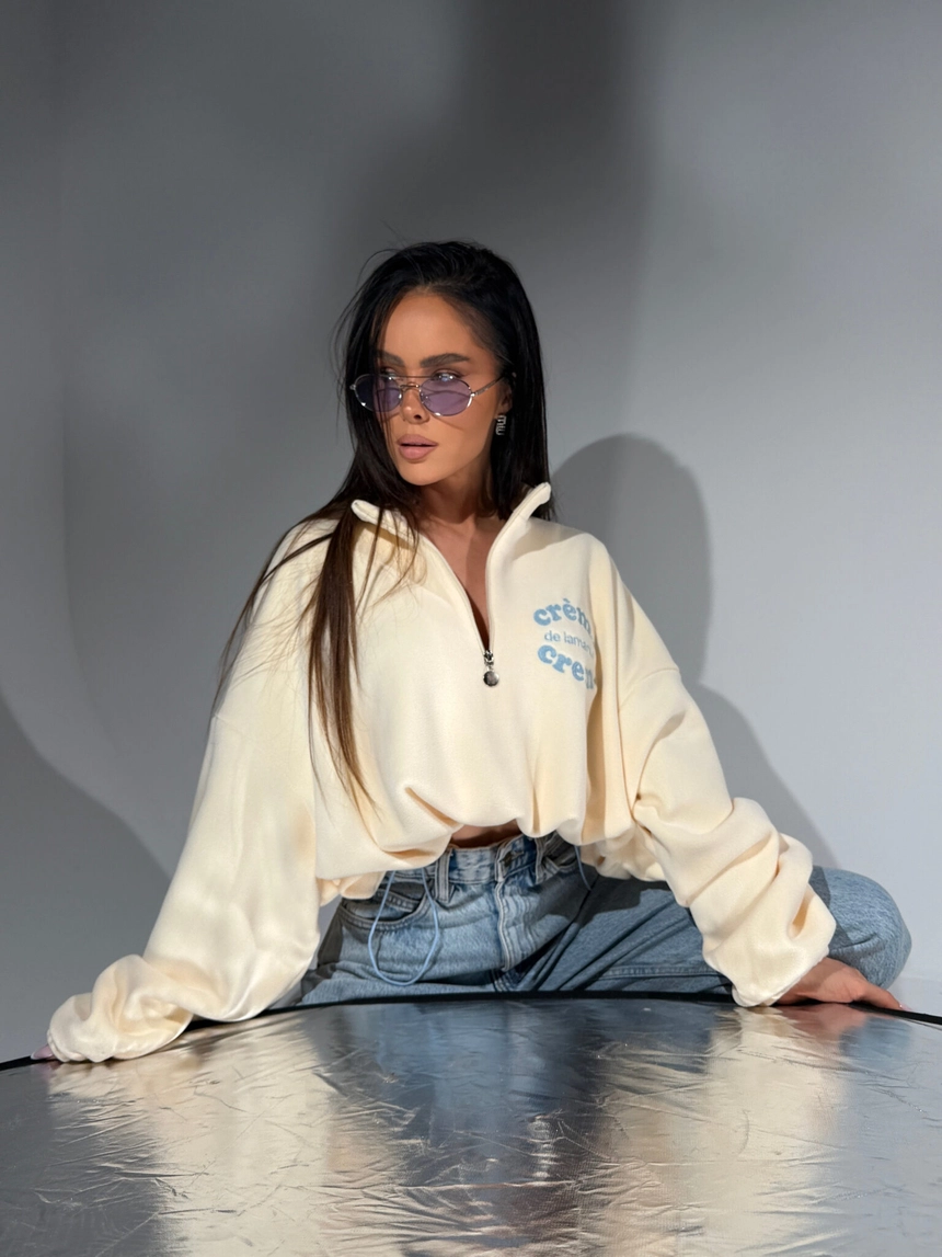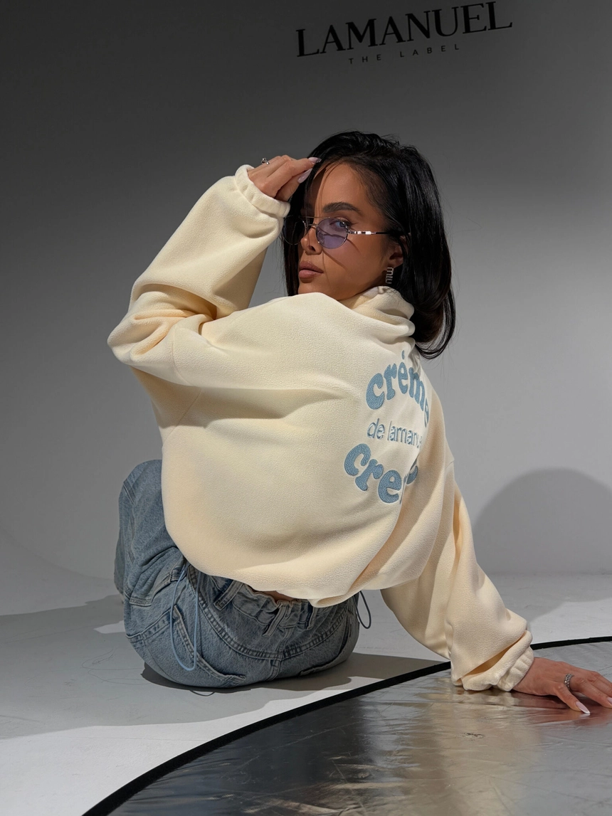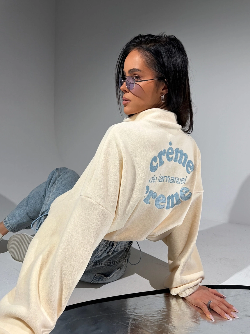 Nasz bestsellerowy krój powraca w nowej odsłonie – tym razem z haftowanym hasłem crème de lamanuel crème, które mówi samo za siebie. Polarowa bluza o oversize’owym kroju z półgolfem i krótkim suwakiem to kwintesencja luzu z paryskim twistem. Miękka, puszysta struktura materiału daje uczucie komfortu i otulenia, a regulowany dół pozwala dopasować fason do sylwetki – noś luźno albo ściągnij dla efektu crop. Ikoniczna, rozpoznawalna, wygodna – nie tylko dla fanek marki, ale dla wszystkich, które wiedzą, że less is more, a styl tkwi w detalach.Skład: 95% poliester 5% elastan