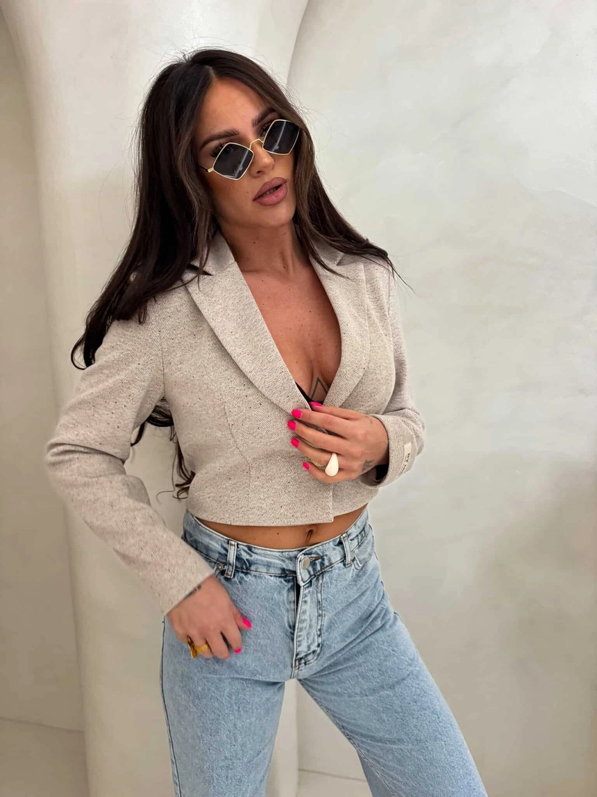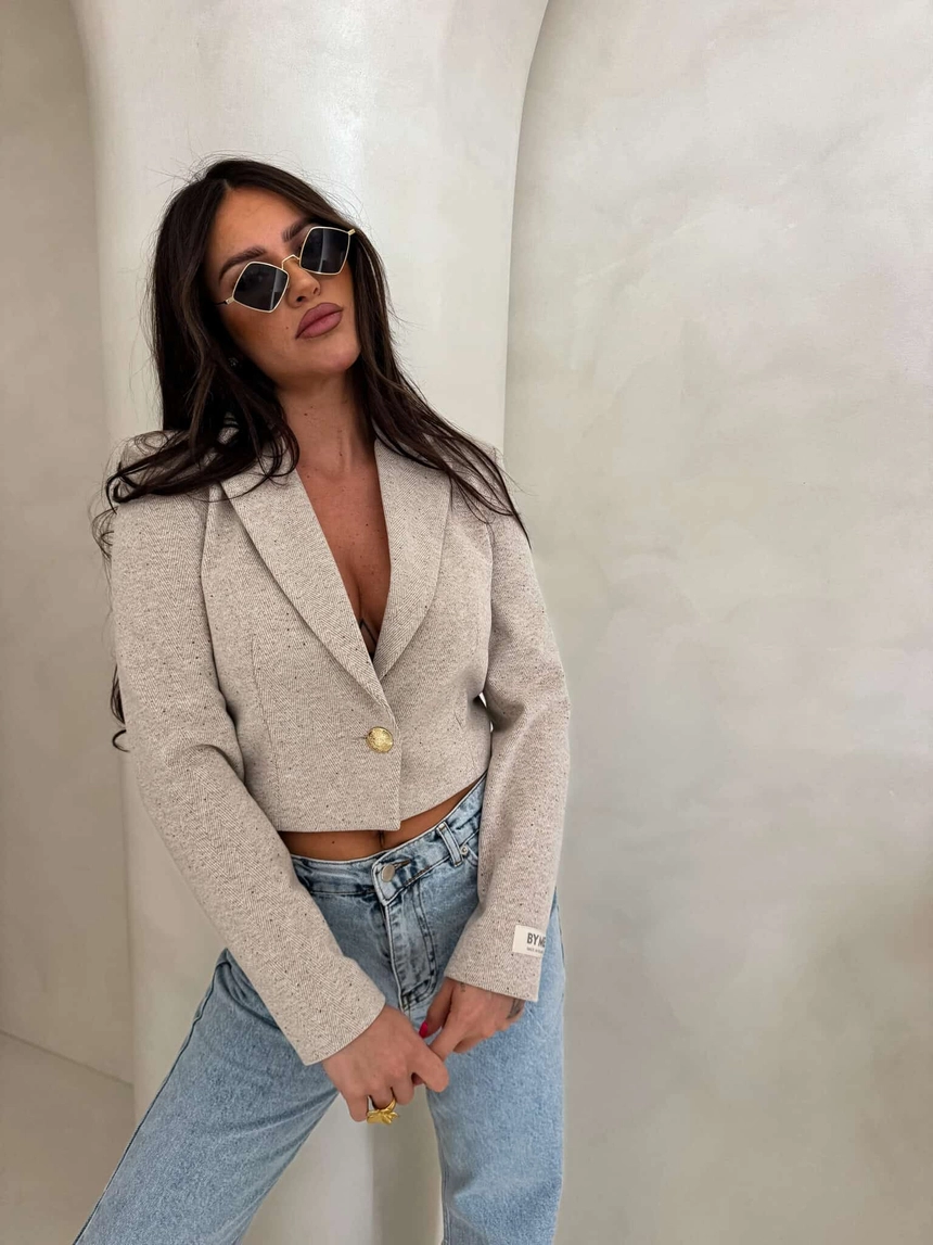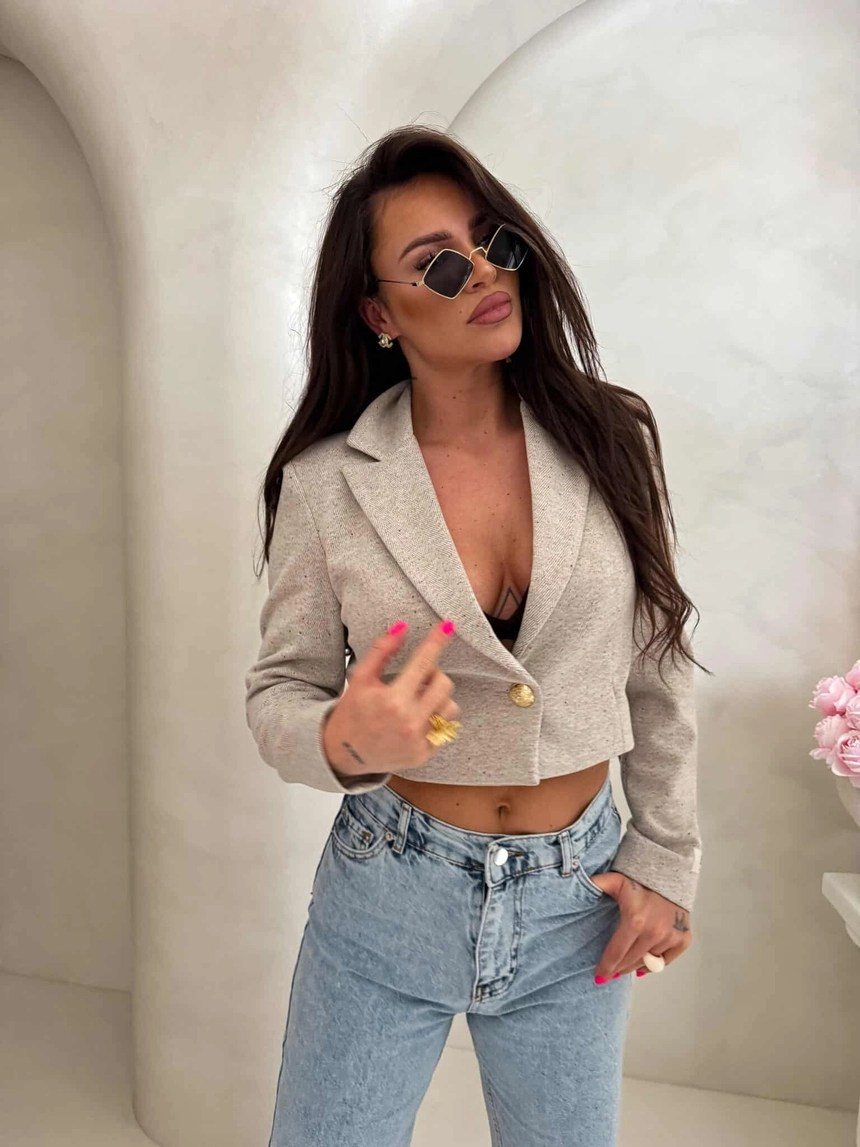Marynarka o krótkim kroju, gładkie wykończenie. Marynarka posiada podszewkę, zapięcie regulowane przy pomocy guzika.