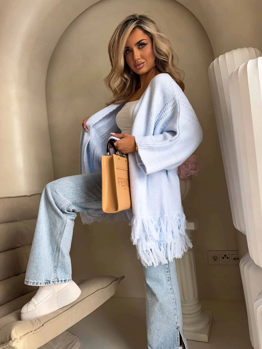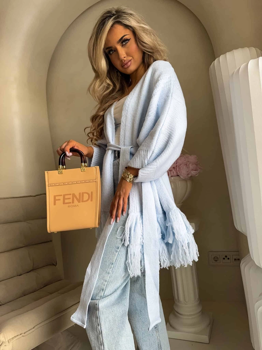 Podkreśl swój styl z kardiganem Oriana. Kardigan ma luźny, otwarty fason, a talię można podkreślić dołączonym paskiem, dzięki czemu sylwetka nabiera kobiecego kształtu. Dół kardiganu ozdobiony frędzlami, które nadają mu lekkości i boho charakteru.
