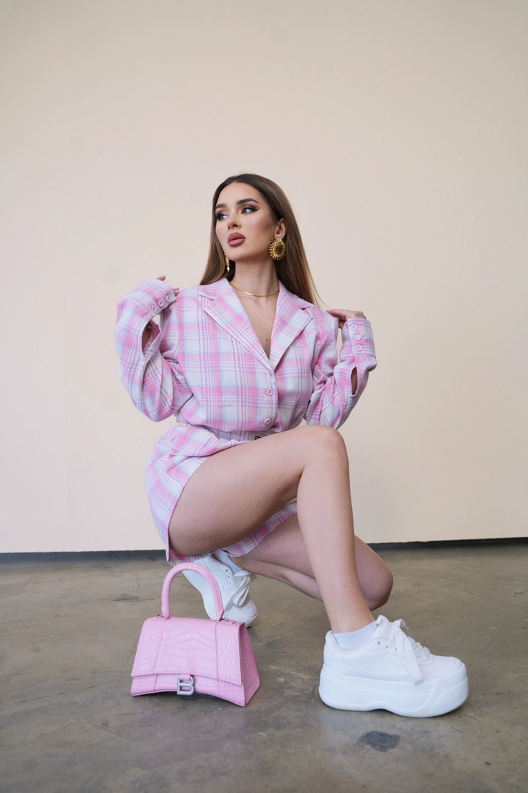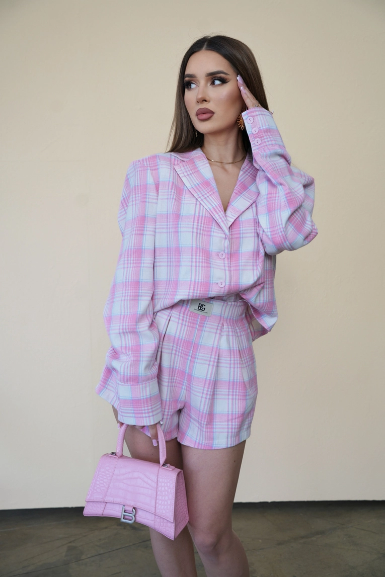 Opis produktu: Komplet damski BG FRANCE z wysokiej jakości kraty. Komplet składa się z koszuli z żakietowym kołnierzem oraz krótkich szortów z eleganckimi zakładkami. Koszula oraz szorty ozdobione elegancką naszywką z logo marki.