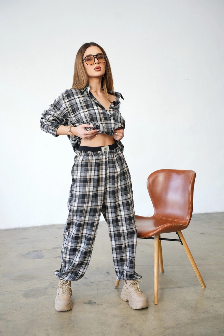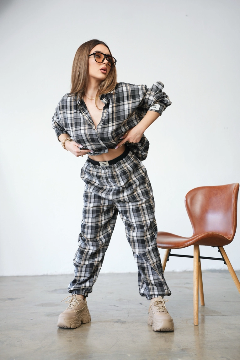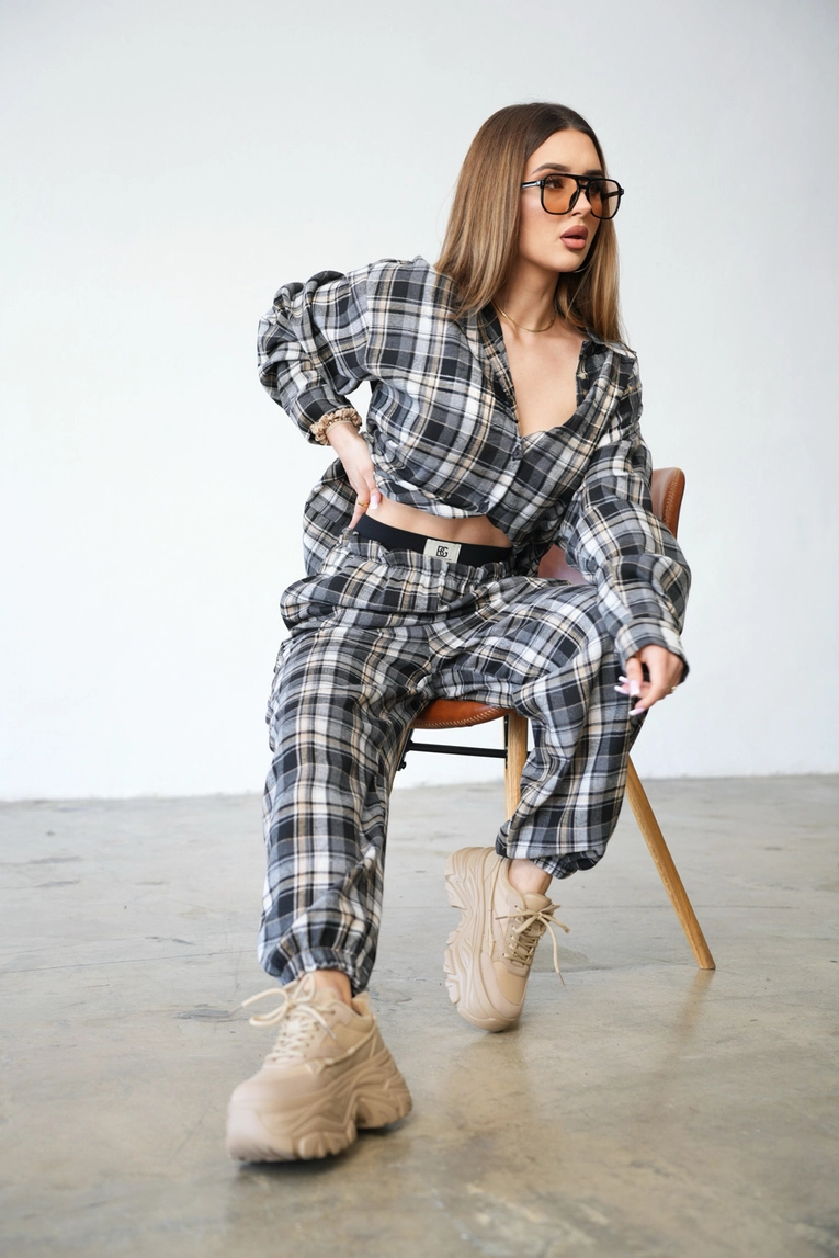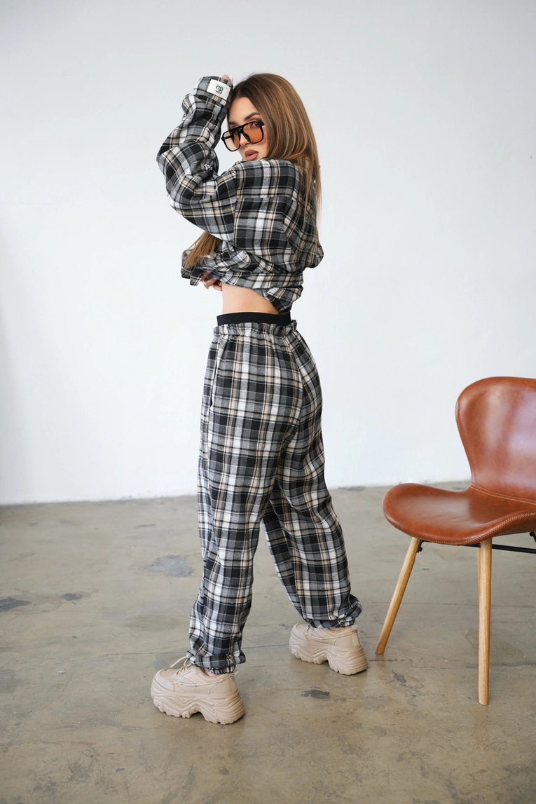 Opis produktu: Spodnie w kratkę BG FRIDAY. Spodnie o luźnym kroju z gumkami w dole nogawki. W okolicach szerokiego pasa ozdobne marszczenie. Na środku pasa naszywka z logo marki.