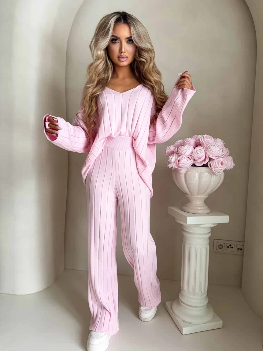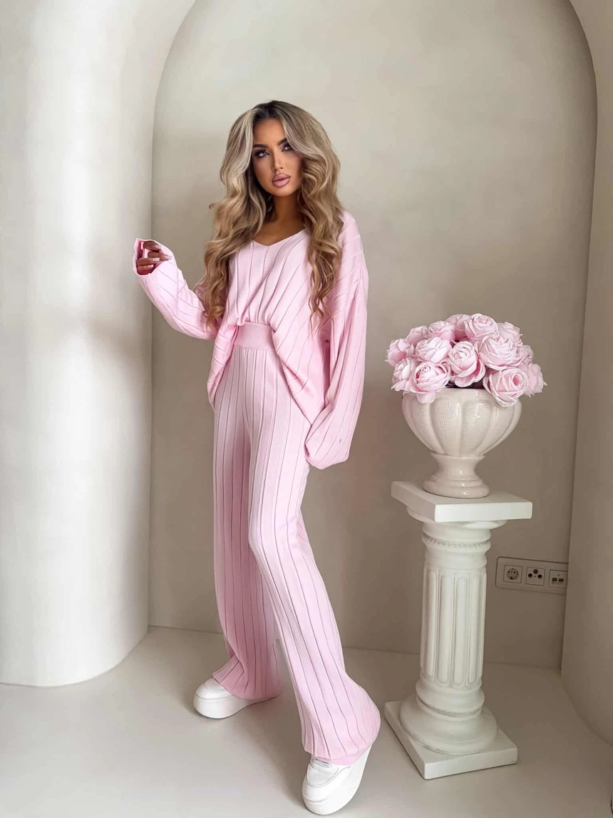 Komplet składa się z oversize'owego swetra z długimi rękawami oraz spodni z wysokim stanem, uszytych z tej samej, przyjemnej w dotyku dzianiny. Sweter zakładany przez głowę, z dekoltem w serek, zdobią ozdobne pionowe przeszycia, które optycznie wydłużają sylwetkę i dodają całości subtelnej elegancji. Szerokie nogawki spodni oraz ich pionowy wzór doskonale współgrają z górą, tworząc spójną, harmonijną stylizację idealną zarówno na co dzień, jak i na bardziej casualowe wyjścia.