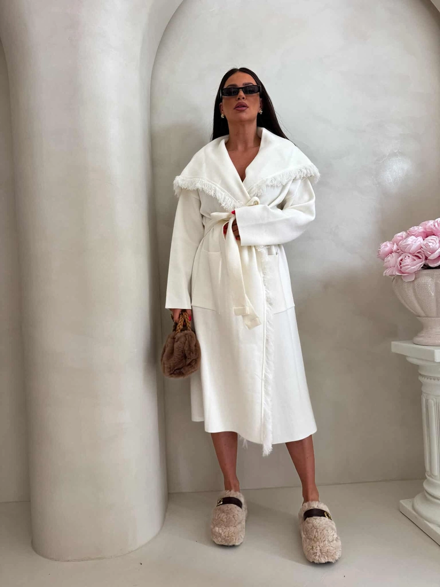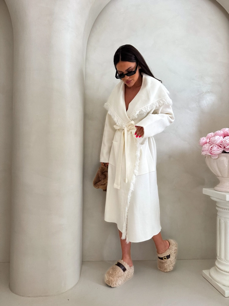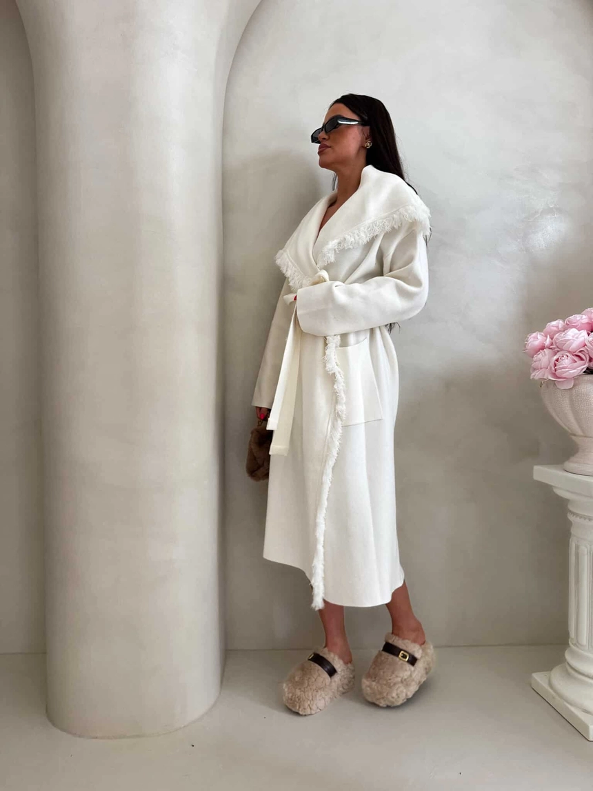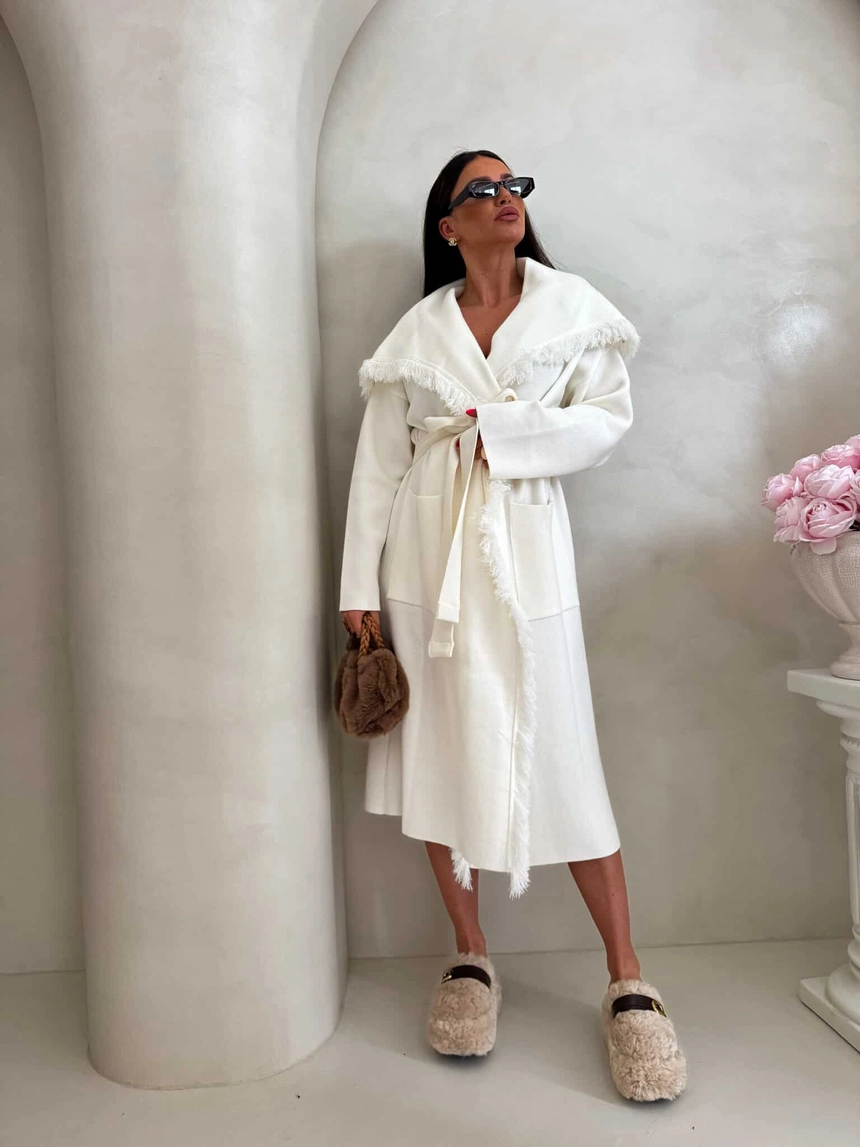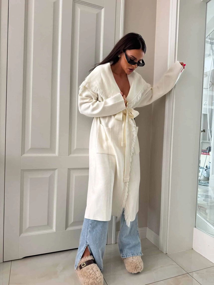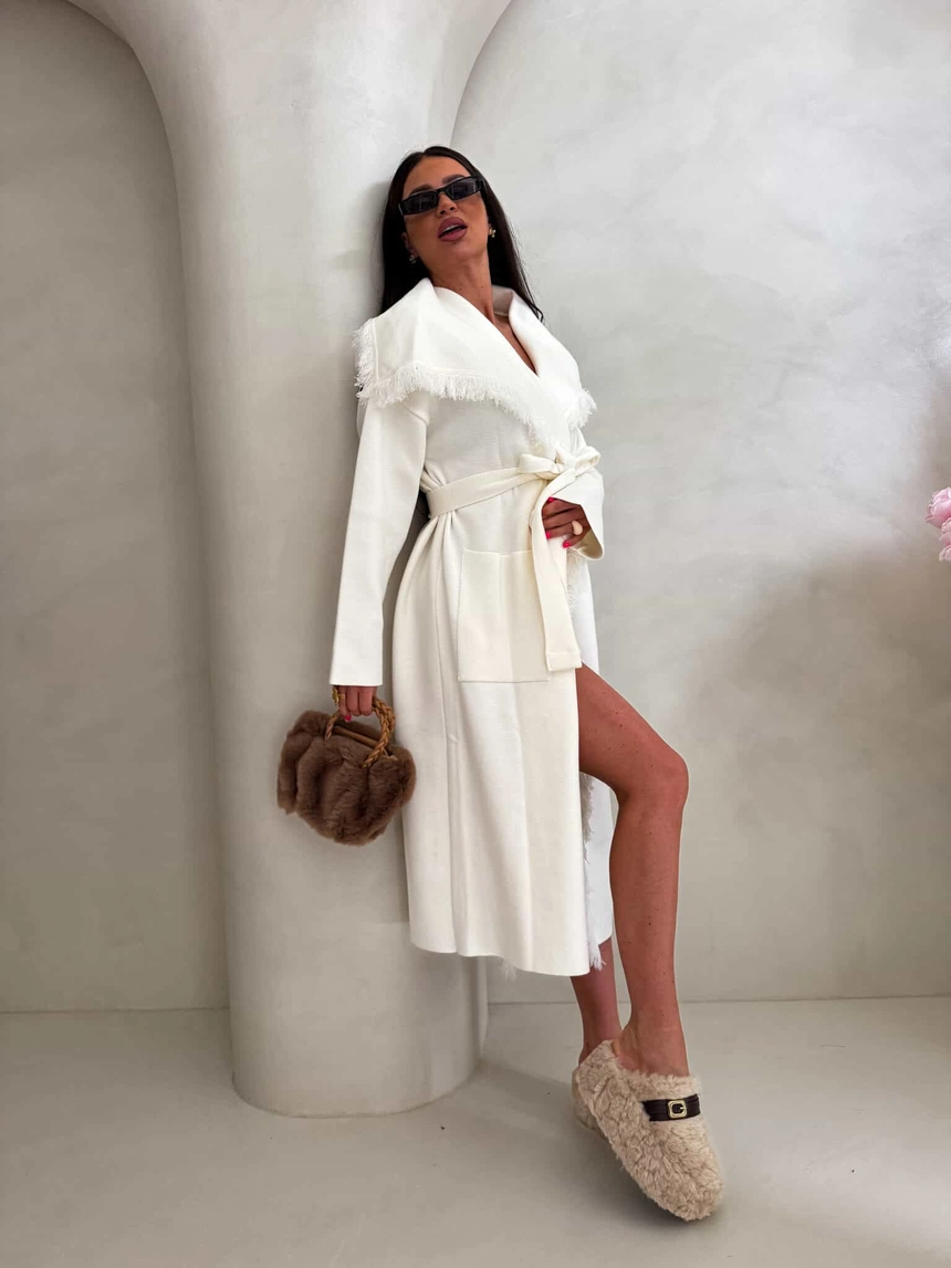 Płaszcz DIVA to model o lekko oversize’owym kroju, wiązany w pasie szerokim paskiem, który pięknie podkreśla talię i pozwala dopasować sylwetkę do własnych preferencji. Długość sięgająca za kolano. Szeroki, opadający kołnierz został ozdobiony dekoracyjnymi strzępieniami, które pojawiają się również wzdłuż zapięcia oraz na dole płaszcza. Po bokach znajdują się praktyczne, wpuszczane kieszenie.
