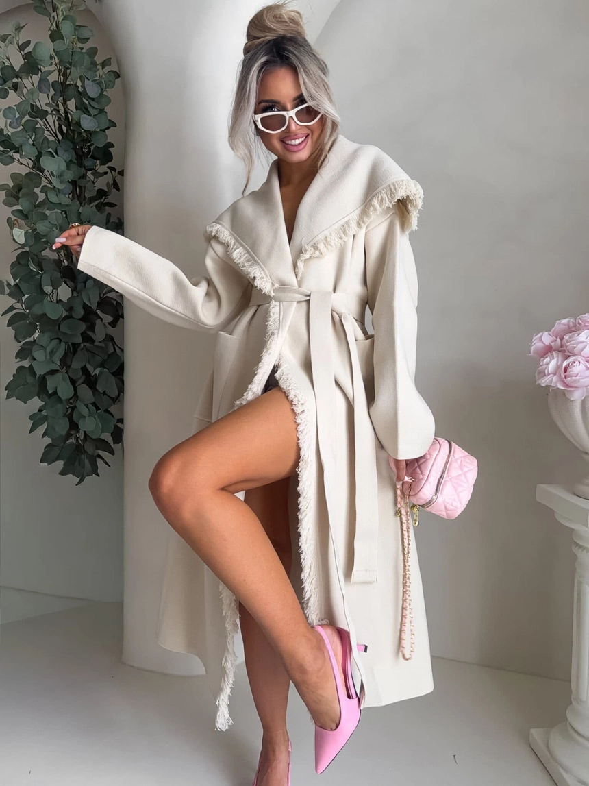Płaszcz DIVA to model o lekko oversize’owym kroju, wiązany w pasie szerokim paskiem, który pięknie podkreśla talię i pozwala dopasować sylwetkę do własnych preferencji. Długość sięgająca za kolano. Szeroki, opadający kołnierz został ozdobiony dekoracyjnymi strzępieniami, które pojawiają się również wzdłuż zapięcia oraz na dole płaszcza. Po bokach znajdują się praktyczne, wpuszczane kieszenie.